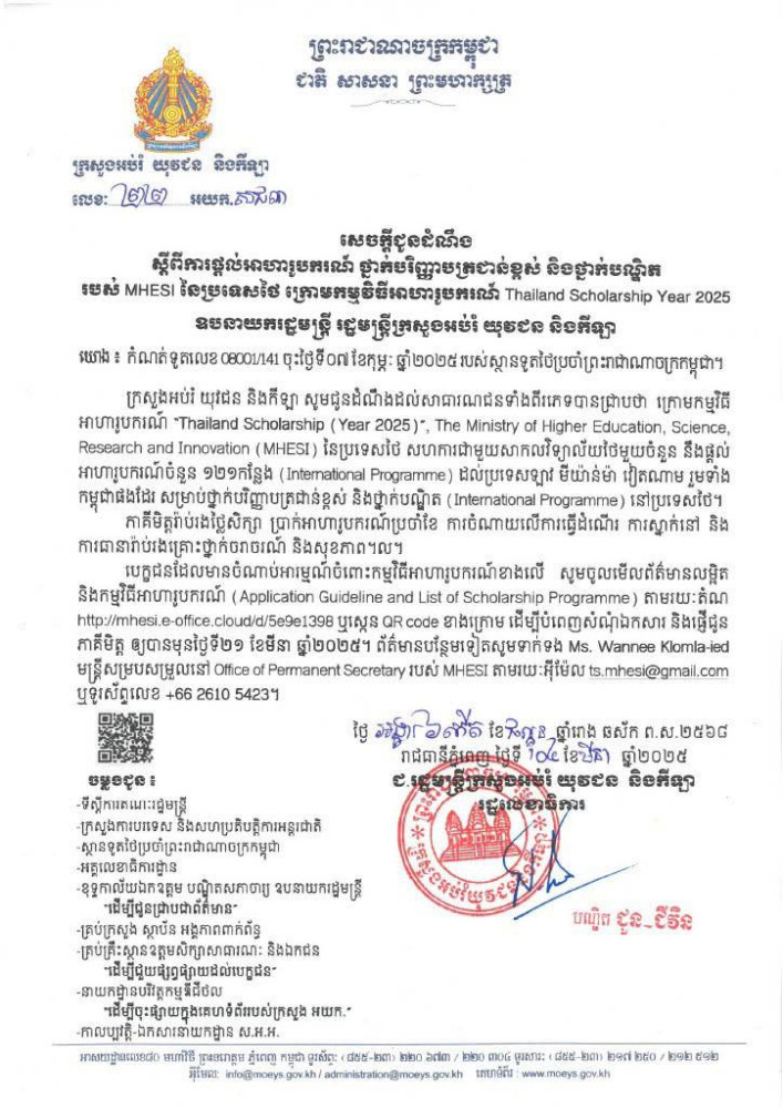 AKP ភ្នំពេញ ថ្ងៃទី០៤ ខែមីនា ឆ្នាំ២០២៥-- ក្រសួងអប់រំ យុវជន និងកីឡា បានចេញសេចក្តីជូនដំណឹងមួយដល់យុវជន សិស្ស-និស្សិត អំពីកម្មវិធី អាហារូបករណ៍ "Thailand Scholarship (Year 2025)", The Ministry of Higher Education, Science, Research and Innovation (MHESI) នៃប្រទេសថៃ សហការជាមួយសាកលវិទ្យាល័យថៃមួយចំនួននឹងផ្តល់ អាហារូបករណ៍ចំនួន១២១កន្លែង (International Programme) ដល់ប្រទេសឡាវ មីយ៉ាន់ម៉ា វៀតណាម រួមទាំង កម្ពុជាផងដែរ សម្រាប់ថ្នាក់បរិញ្ញាបត្រជាន់ខ្ពស់ និងថ្នាក់បណ្ឌិត (International Programme) នៅប្រទេសថៃ។