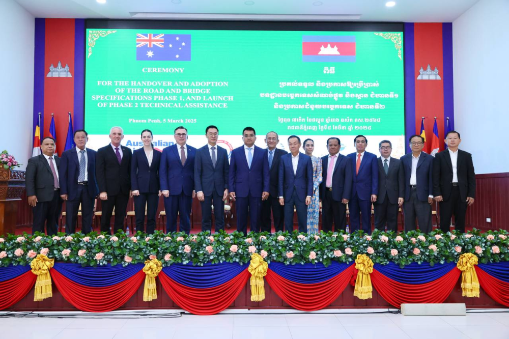 AKP ភ្នំពេញ ថ្ងៃទី០៥ ខែមីនា ឆ្នាំ២០២៥ -- ឯកឧត្តម ប៉េង ពោធិ៍នា រដ្ឋមន្ត្រីក្រសួងសាធារណការ និងដឹកជញ្ជូន និង ឯកឧត្តម ដេរិក យីប (Derek YIP) ឯកអគ្គរដ្ឋទូតអូស្ត្រាលីប្រចាំកម្ពុជា បានអញ្ជើញជាអធិបតីក្នុងពិធីប្រគល់ទទួល និងប្រកាសឱ្យប្រើប្រាស់បទដ្ឋានបច្ចេកទេសសំណង់ផ្លូវ និងស្ពាន ជំហានទី១ និងប្រកាសជំនួយបច្ចេកទេស ជំហានទី២ នៅទីស្តីការក្រសួង នារសៀលថ្ងៃពុធ ទី០៥ ខែមីនា ឆ្នាំ២០២៥ ដោយមានការចូលរួមពីឯកឧត្តម លោកជំទាវ ជាថ្នាក់ដឹកនាំក្រសួង លោក Geoff Allan នាយកប្រតិបត្តិ Austroads តំណាងក្រសួង-ស្ថាប័ន ដៃគូអភិវឌ្ឍន៍ និងមន្រ្តីពាក់ព័ន្ធ។
