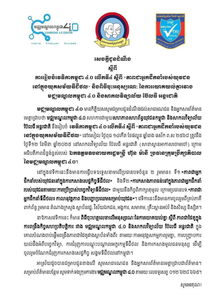 មជ្ឈមណ្ឌលកម្ពុជា ៤.០ នឹងរៀបចំវេទិកាកម្ពុជា ៤.០ លើកទី៤ ស្តីពី "ភាពជាអ្នកដឹកនាំរបស់យុវជននៅក្នុងយុគសម័យឌីជីថល" នៅសាកលវិទ្យាល័យ ប៊ែលធី អន្តរជាតិ