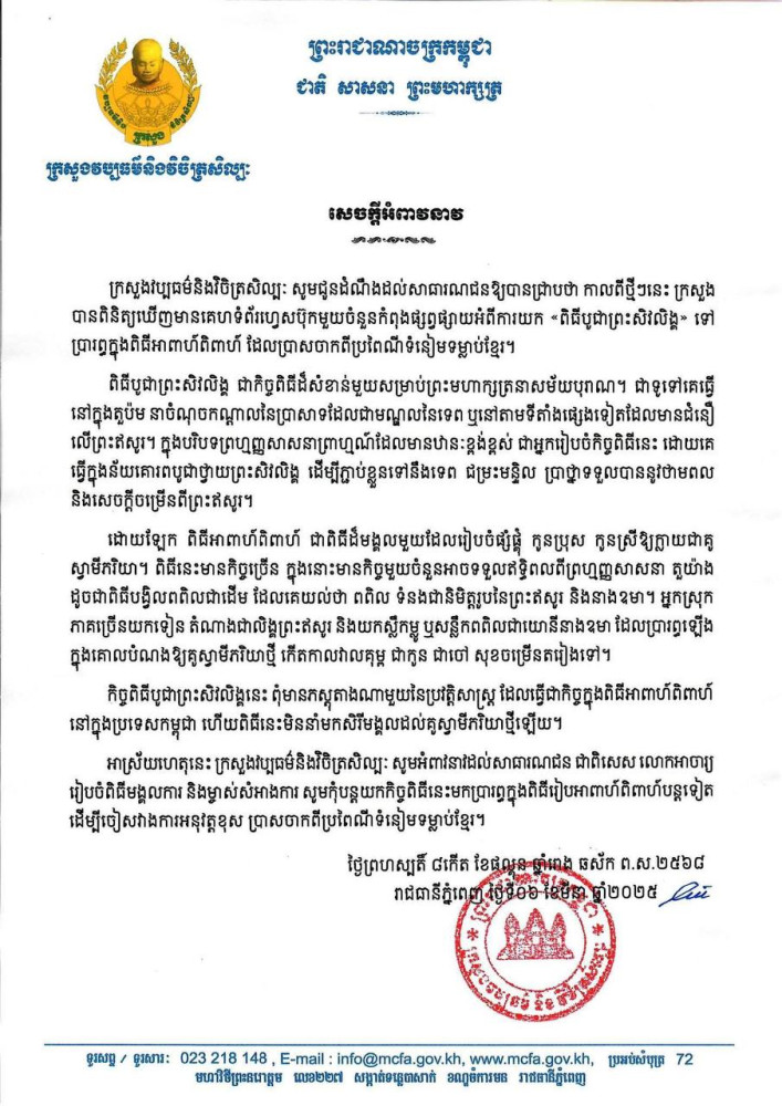 AKP ភ្នំពេញ ថ្ងៃទី០៦ ខែមីនា ឆ្នាំ២០២៥-- ក្រសួងវប្បធម៌ និងវិចិត្រសិល្បៈបានចេញសេចក្តីអំពាវនាវមួយដោយបញ្ជាក់ថា កាលពីថ្មីៗនេះ ក្រសួងបានពិនិត្យឃើញមានគេហទំព័រហ្វេសប៊ុកមួយចំនួនកំពុងផ្សព្វផ្សាយអំពីការយក «ពិធីបូជាព្រះសិវលិង្គ» ទៅប្រារព្ធក្នុងពិធីអាពាហ៍ពិពាហ៍ ដែលប្រាសចាកពីប្រពៃណីទំនៀមទម្លាប់ខ្មែរ។