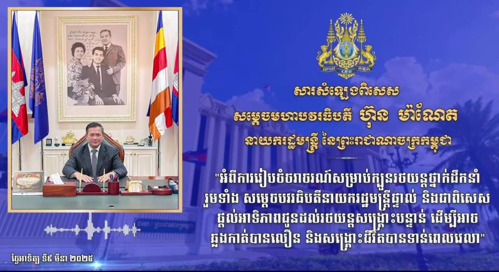 AKP ភ្នំពេញ ថ្ងៃទី០៩ ខែមីនា ឆ្នាំ២០២៥--សម្ដេចមហាបវរធិបតី ហ៊ុន ម៉ាណែត តាមរយៈសារជាសំណេរ អមដោយសំឡេង បង្ហោះតាមបណ្ដាញសង្គម នារសៀលថ្ងៃទី០៩ ខែមីនា ឆ្នាំ២០២៥នេះ បានស្នើឱ្យសមត្ថកិច្ចសម្រួលចរាចរណ៍ប្រកបដោយភាពបត់បែនទៅតាមករណីចាំបាច់នីមួយៗ ជាពិសេសករណីពាក់ព័ន្ធជាមួយរថយន្តសង្គ្រោះបន្ទាន់ ដើម្បីជួយសង្រ្គោះជីវិតអ្នកជំងឺឱ្យបានទាន់ពេលវេលា។