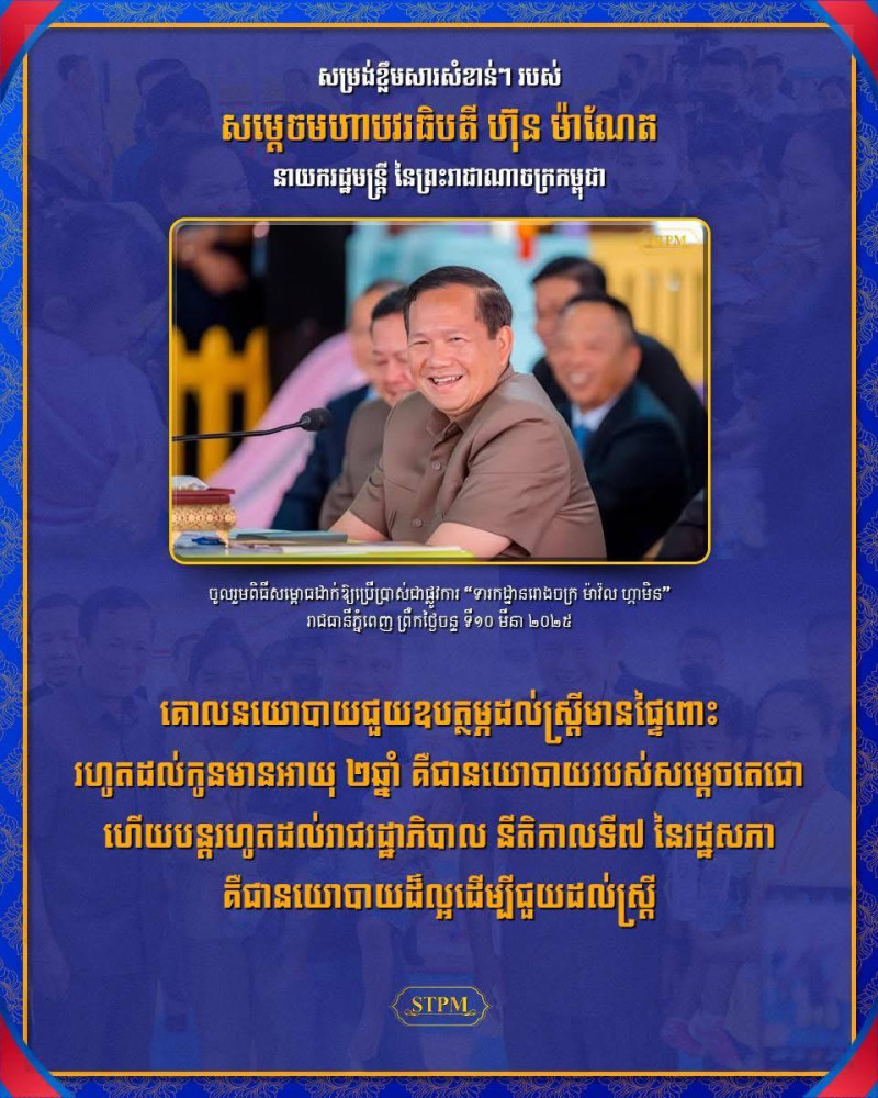 ក្នុងឱកាសសំណេះសំណាលជាមួយកម្មករនយោជិត និងសម្ពោធទារកដ្ឋាន នៅរោងចក្រម៉ាវ៉ល ហ្កាមិន នាព្រឹកថ្ងៃទី១០ ខែមីនា ឆ្នាំ២០២៥, សម្ដេចមហាបវរធិបតី ហ៊ុន ម៉ាណែត នាយករដ្ឋមន្ត្រី នៃព្រះរាជាណាចក្រកម្ពុជា បានមានប្រសាសន៍ថា គោលនយោបាយជួយឧបត្ថម្ភដល់ស្រ្តីមានផ្ទៃពោះ រហូតដល់កូនមានអាយុ ២ឆ្នាំ គឺជានយោបាយរបស់សម្តេចតេជោ ហើយបន្តរហូតដល់រាជរដ្ឋាភិបាល នីតិកាលទី៧ នៃរដ្ឋសភា គឺជានយោបាយដ៏ល្អដើម្បីជួយដល់ស្រ្តី ដោយក្នុងនោះ ស្ត្រីមានផ្ទៃពោះ នៅពេលពិនិត្យសុខភាព នឹងទទួលបានប្រាក់ឧបត្ថម្ភ ៨ម៉ឺនរៀលក្នុង១លើក ហើយត្រូវពិនិត្យផ្ទៃពោះចំនួន៤លើក មុនពេលសម្រាល, ពេលឆ្លងទន្លេ កូន១ ទទួលបានថវិកាឧបត្ថម្ភចំនួន ៨០ម៉ឺន កូនភ្លោះ២ ទទួលបាន ១ លាន ២ សែន រៀល កូនភ្លោះ៣ ទទួលបាន ១ លាន ៦ សែន រៀល និងការឧបត្ថម្ភពីសម្ដេចតេជោ និងសម្ដេចកិត្តិព្រឹទ្ធបណ្ឌិត ចំនួន៥លានរៀល ថែមទៀត។