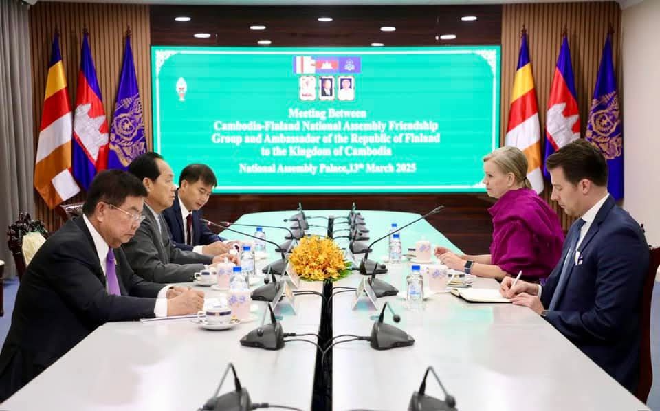 AKP ភ្នំពេញ ថ្ងៃទី១៣ ខែមីនា ឆ្នាំ២០២៥ -- ឯកឧត្តម ជា សុផារ៉ា ប្រធានក្រុមមិត្តភាពរដ្ឋសភាកម្ពុជា-អង់គ្លេស និងឯកឧត្តម ស៊ុយ សែម តំណាងរាស្រ្តមណ្ឌលខេត្តពោធិសាត់ និងជាសមាជិកក្រុមមិត្តភាពរដ្ឋសភាកម្ពុជា-អង់គ្លេស នាព្រឹកថ្ងៃទី១៣ ខែមីនា ឆ្នាំ២០២៥ បានជួបពិភាក្សាការងារជាមួយលោកជំទាវ Christiina Kuvaja-Xanthopoulos ឯកអគ្គរដ្ឋទូតវិសាមញ្ញនិងពេញសមត្ថភាពនៃប្រទេសហ្វាំងឡង់ប្រចាំព្រះរាជាណាចក្រកម្ពុជា នៅវិមានរដ្ឋសភា។