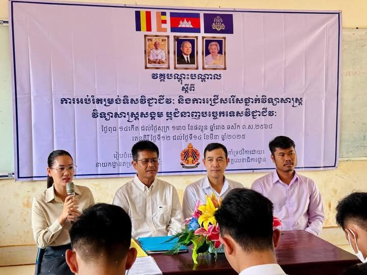 AKP ភ្នំពេញ ថ្ងៃទី១៣ ខែមីនា ឆ្នាំ២០២៥-- នាយកដ្ឋានតម្រង់ទិសវិជ្ជាជីវៈ ក្រោមការគាំទ្រពីអគ្គលេខាធិការដ្ឋាននៃក្រសួងអប់រំ យុវជន និងកីឡា នៅថ្ងៃទី១៣ ខែមីនា ឆ្នាំ២០២៥ បានរៀបចំវគ្គបណ្ដុះបណ្ដាលស្ដីពី «ការអប់រំតម្រង់ទិសវិជ្ជាជីវៈ និងការជ្រើសរើសថ្នាក់វិទ្យាសាស្ត្រ វិទ្យាសាស្ត្រសង្គម ឬជំនាញបច្ចេកទេសវិជ្ជាជីវៈ» នៅវិទ្យាល័យបរកែវ ស្រុកបរកែវ ខេត្តរតនគិរី។