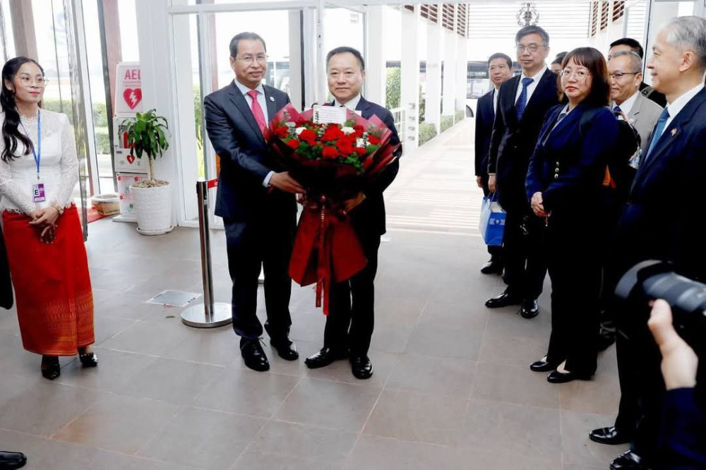 AKP ភ្នំពេញ ថ្ងៃទី១៦ ខែមីនា ឆ្នាំ២០២៤ -- ឯកឧត្តម ឈា ប៊ុនរិទ្ធ រដ្ឋលេខាធិការប្រចាំការ ក្នុងនាមតំណាងដ៏ខ្ពង់ខ្ពស់ឯកឧត្តម ថោ ជេដ្ឋា រដ្ឋមន្ត្រីក្រសួងធនធានទឹក និងឧតុនិយម ដោយមានការចូលរួមពីឯកឧត្តម លោកជំទាវ លោក លោកស្រី ជាថ្នាក់ដឹកនាំ និងមន្ត្រីរាជការនៃក្រសួងធនធានទឹក និងឧតុនិយម បានអញ្ជើញទទួលស្វាគមន៍ឯកឧត្តម លី គូយីង (Li Guoying) រដ្ឋមន្ត្រីក្រសួងធនធានទឹកនៃសាធារណរដ្ឋប្រជាមានិតចិន និងគណៈប្រតិភូអមដំណើរ នៅអាកាសយានដ្ឋានអន្តរជាតិភ្នំពេញ នៅព្រឹកថ្ងៃអាទិត្យ ៣រោច ខែផល្គុន ឆ្នាំរោង ឆស័ក ពុទ្ធសករាជ ២៥៦៨ ត្រូវនឹងថ្ងៃទី១៦ ខែមីនា ឆ្នាំ២០២៥ នេះ។