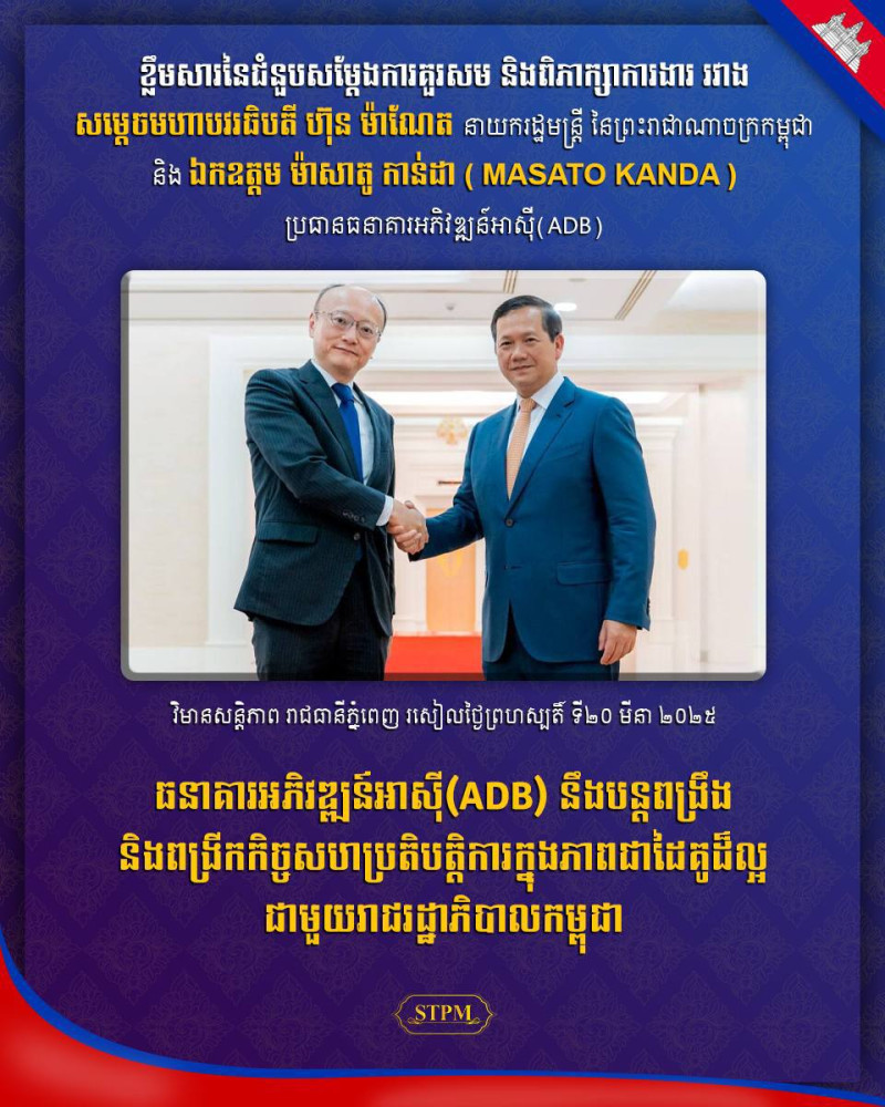 សម្ដេចមហាបវរធិបតី ហ៊ុន ម៉ាណែត នាយករដ្ឋមន្ត្រីនៃព្រះរាជាណាចក្រកម្ពុជា នារសៀលថ្ងៃទី២០ ខែមីនា ឆ្នាំ២០២៥នេះ បានអនុញ្ញាតឱ្យ ឯកឧត្តម ម៉ាសាតូ កាន់ដា (MASATO KANDA) ប្រធានធនាគារអភិវឌ្ឍន៍អាស៊ី (ADB) ចូលជួបសម្តែងការគួរសម និងពិភាក្សាការងារ នៅវិមានសន្ដិភាព។