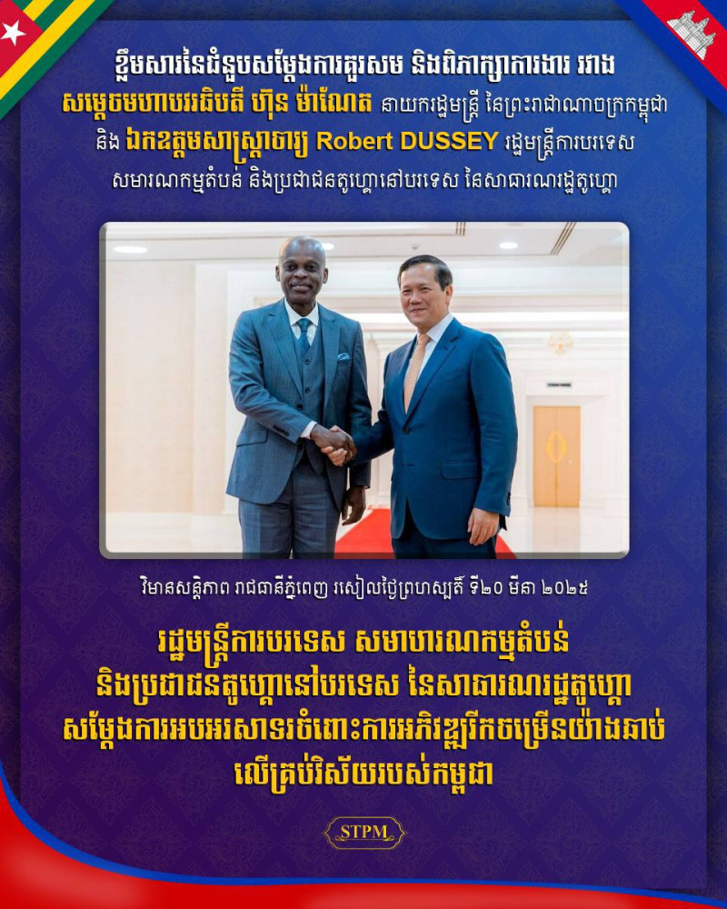 សម្ដេចមហាបវរធិបតី ហ៊ុន ម៉ាណែត នាយករដ្ឋមន្ត្រីនៃព្រះរាជាណាចក្រកម្ពុជា នារសៀលថ្ងៃទី២០ ខែមីនា ឆ្នាំ២០២៥នេះ បានអនុញ្ញាតឱ្យ ឯកឧត្តមសាស្ត្រាចារ្យ Robert DUSSEY រដ្ឋមន្ត្រីការបរទេស សមារណកម្មតំបន់ និងប្រជាជនតូហ្គោនៅបរទេស នៃសាធារណរដ្ឋតូហ្គោ និងគណៈប្រតិភូ ចូលជួបសម្តែងការគួរសម និងពិភាក្សាការងារនៅវិមានសន្តិភាព។