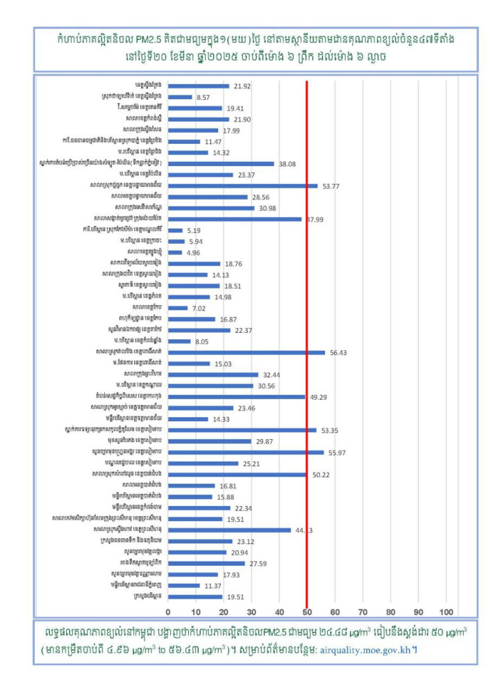 AKP ភ្នំពេញ ថ្ងៃទី២១ ខែមីនា ឆ្នាំ២០២៥-- ក្រសួងបរិស្ថានបានបញ្ជាក់ថា ស្ថានភាពគុណភាពខ្យល់នៅក្នុងប្រទេសកម្ពុជា សម្រាប់ថ្ងៃទី២០ ខែមីនា ឆ្នាំ២០២៥ ចាប់ពីម៉ោង៦ ព្រឹក ដល់ម៉ោង៦ ល្ងាច មានកំហាប់ភាគល្អិតនិចលគិតជាមធ្យមស្មើនឹង២៤.៤៨ µg/m3 ធៀបនឹងស្តង់ដារ ៥០ ug/m3 និងគិតជាសន្ទស្សន៍គុណភាពខ្យល់ (Air Quality Index) គឺ “ល្អណាស់”។