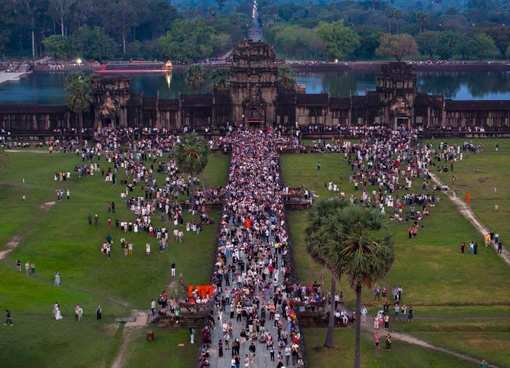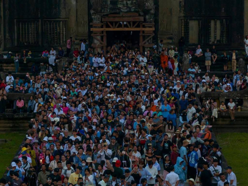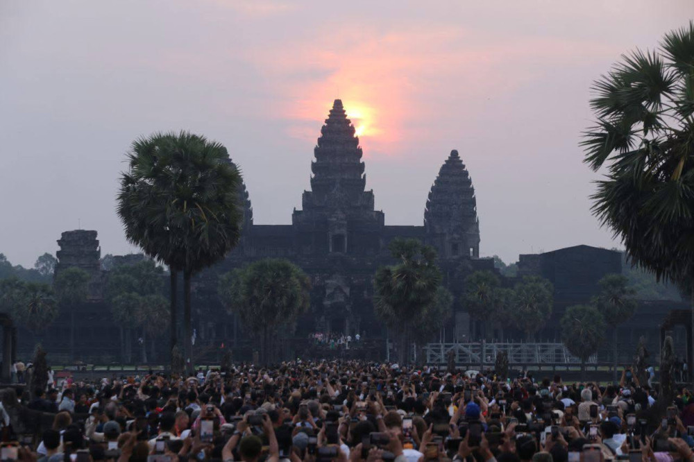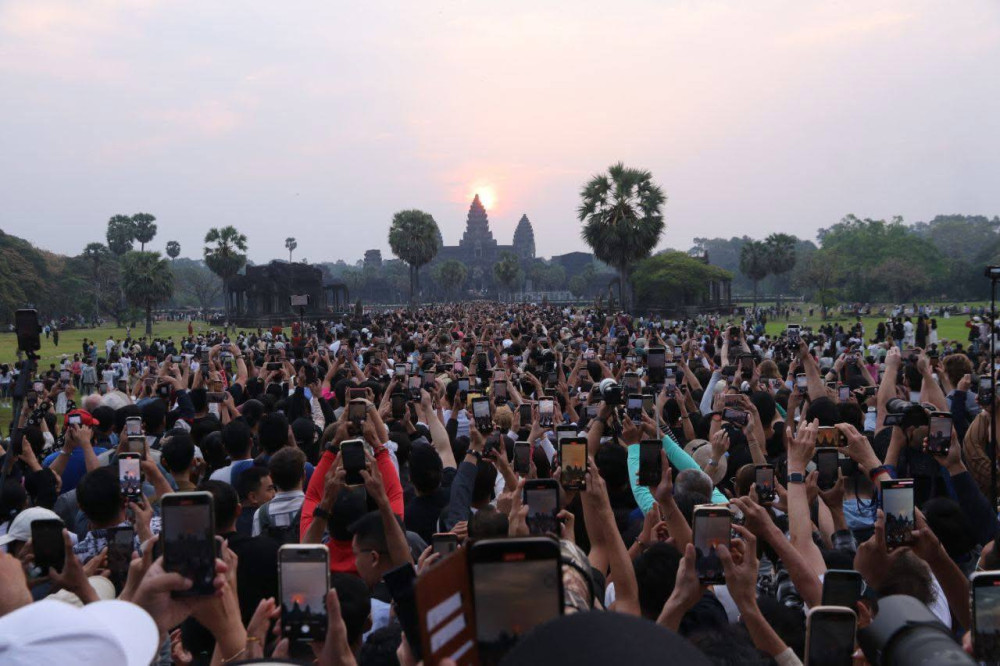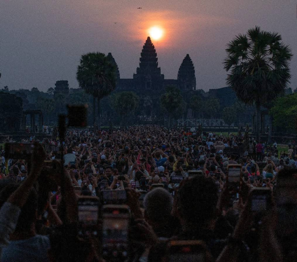 AKP ភ្នំពេញ ថ្ងៃទី២១ ខែមីនា ឆ្នាំ២០២៥-- អ្នកទេសចរយ៉ាងច្រើនកុះករមកពីគ្រប់ទិសទីដោយក្នុងនេះច្រើនជាង២ម៉ឺននាក់បាននាំគ្នាមក ដើម្បីរង់ចាំទស្សនាថ្ងៃរះចំកំពូលកណ្តាលប្រាសាទអង្គរវត្ត។