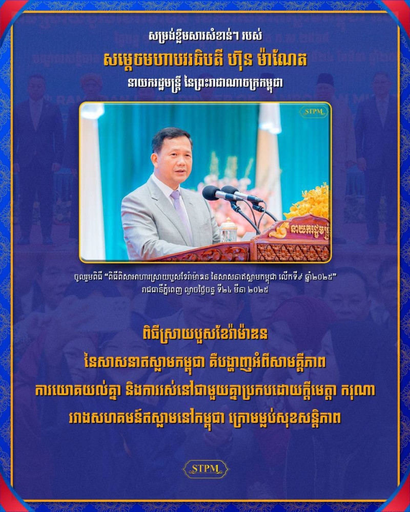 AKP ភ្នំពេញ ថ្ងៃទី២៥ ខែមីនា ឆ្នាំ២០២៥–សម្តេចមហាបវរធិបតី ហ៊ុន ម៉ាណែត នាយករដ្ឋមន្ត្រីនៃព្រះរាជាណាចក្រកម្ពុជា បានថ្លែងក្នុងពិធី ពិសាអាហារស្រាយបួសខែរ៉ាម៉ាឌន នៃសាសនាឥស្លាមកម្ពុជា លើកទី៩ ឆ្នាំ២០២៥ នាល្ងាចថ្ងៃចន្ទ ទី២៤ ខែមីនា ឆ្នាំ២០២៥ ថា ពិធីស្រាយបួសខែរ៉ាម៉ាឌន នៃសាសនាឥស្លាមកម្ពុជា គឺបង្ហាញអំពីសាមគ្គីភាព ការយោគយល់គ្នា និងការរស់នៅជាមួយគ្នាប្រកបដោយក្តីមេត្តា ករុណា រវាងសហគមន៍ឥស្លាមនៅកម្ពុជា ក្រោមម្លប់សុខសន្តិភាព ហើយក៏ជាឱកាសសម្រាប់ឱ្យអ្នកចូលរួមពិធី បានជួបប្រាស្រ័យទាក់ទងគ្នាកាន់តែជិតស្និទ ផ្លាស់ប្តូរគំនិតយោបល់ ចែករំលែកបទពិសោធន៍ល្អៗ និងពង្រឹងកិច្ចសហប្រតិបត្តិការ ដើម្បីរួមចំណែកដល់ការលើកស្ទួយសុខដុមនីយកម្មជាតិសាសន៍ និងសាសនានៅកម្ពុជា សំដៅថែរក្សានូវសុខសន្តិភាព ស្ថិរភាព និងសុវត្ថិភាពទាំងផ្លូវកាយ ផ្លូវចិត្ត និងស្មារតីនៅក្នុងការអភិវឌ្ឍសង្គមសេដ្ឋកិច្ចជាតិ។