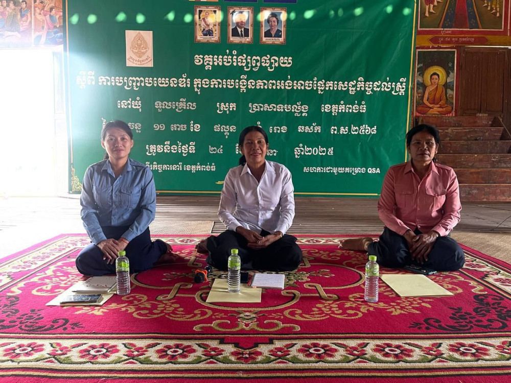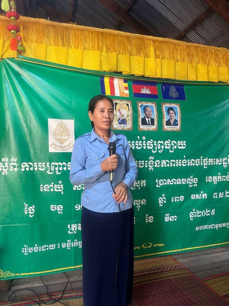 AKP កំពង់ធំ ថ្ងៃទី២៥ ខែមីនា ឆ្នាំ២០២៥--មន្ទីរកិច្ចការនារីខេត្តកំពង់ធំសហការជាមួយគម្រោងQSA បានបើកវគ្គអប់រំផ្សព្វផ្សាយស្ដីពីការបញ្ជ្រាបយេនឌ័រក្នុងការបង្កើនភាពអង់អាចផ្នែកសេដ្ឋកិច្ចដល់ស្ត្រី ក្រោមអធិបតីភាពលោកស្រី ស៊ិន ស៊ីផាន ប្រធានមន្ទីរកិច្ចការនារី ដោយមានការអញ្ជើញចូលរួមពីលោកស្រី ឃួន ឡេ អភិបាលរងស្រុកប្រាសាទបល្ល័ង្ក មន្រ្តីមន្ទីរកិច្ចការនារីខេត្ត ការិយាល័យសង្គមកិច្ច និងសុខុមាលភាពសង្គមថ្នាក់ស្រុក ក្រុមប្រឹក្សាឃុំ មេភូមិ អនុភូមិ សមាជិកភូមិ និងប្រជាពលរដ្ឋក្នុងឃុំទួលគ្រើល និងឃុំសាលាវិស័យ។ វគ្គអប់រំផ្សព្វផ្សាយស្ដីពីការបញ្ជ្រាបយេនឌ័រក្នុងការបង្កើនភាពអង់អាចផ្នែកសេដ្ឋកិច្ចដល់ស្ត្រីរៀបចំឡើងនៅពីរទីតាំងផ្សេងគ្នា។ពេលព្រឹកនៅបរិវេណវត្តក្រពើចាស់ឃុំទួលគ្រើលមានប្រជាពលរដ្ឋចូលរួមសរុប១០២នាក់ (ស្រី៥៤នាក់) និងពេលរសៀលនៅបរិវេណវត្តខ្វាន់ទៀងឃុំសាលាវិស័យមានប្រជាពលរដ្ឋចូលរួមសរុប១០៤នាក់ (ស្រី៨៥នាក់)។