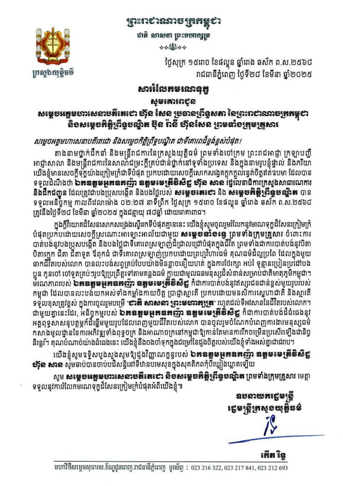 ក្នុងក្តីវិយោគដ៏សែនសោកសង្រេងស្ទើររកទីបំផុតគ្មាននេះ យើងខ្ញុំសូមចូលរួមរំលែកនូវមរណទុក្ខដ៏សែនក្រៀមក្រំបំផុតប្រកបដោយសេចក្តីស្រណោះអាឡោះអាល័យជាមួយ សម្តេចទាំងទ្វេ ព្រមទាំងក្រុមគ្រួសារ ចំពោះការ បាត់បង់នូវបងប្រុសបង្កើត និងបងថ្លៃជាទីគោរពស្រឡាញ់ដ៏ជ្រាលជ្រៅបំផុតក្នុងជីវិត ព្រមទាំងជាការបាត់បង់នូវបិតា បិតាក្មេក ជីតា ជីតាទួត ឪពុកធំ ជាទីគោរពស្រឡាញ់ប្រកបដោយព្រហ្មវិហារធម៌ គុណធម៌ដ៏ល្អប្រពៃ ដែលក្នុងមួយ ឆាកជីវិតរបស់លោក បានលះបង់សព្វគ្រប់បែបយ៉ាងមិនខ្លាចនឿយហត់ ក្នុងការថែរក្សា អប់រំ ទូន្មានប្រៀនប្រដៅបង ប្អូន កូនចៅ ចៅទួតគ្រប់ៗរូបឱ្យប្រព្រឹត្តទៅតាមគន្លងធម៌ ក្លាយជាមូលធនមនុស្សដ៏សំខាន់សម្រាប់ជាតិមាតុភូមិកម្ពុជា។