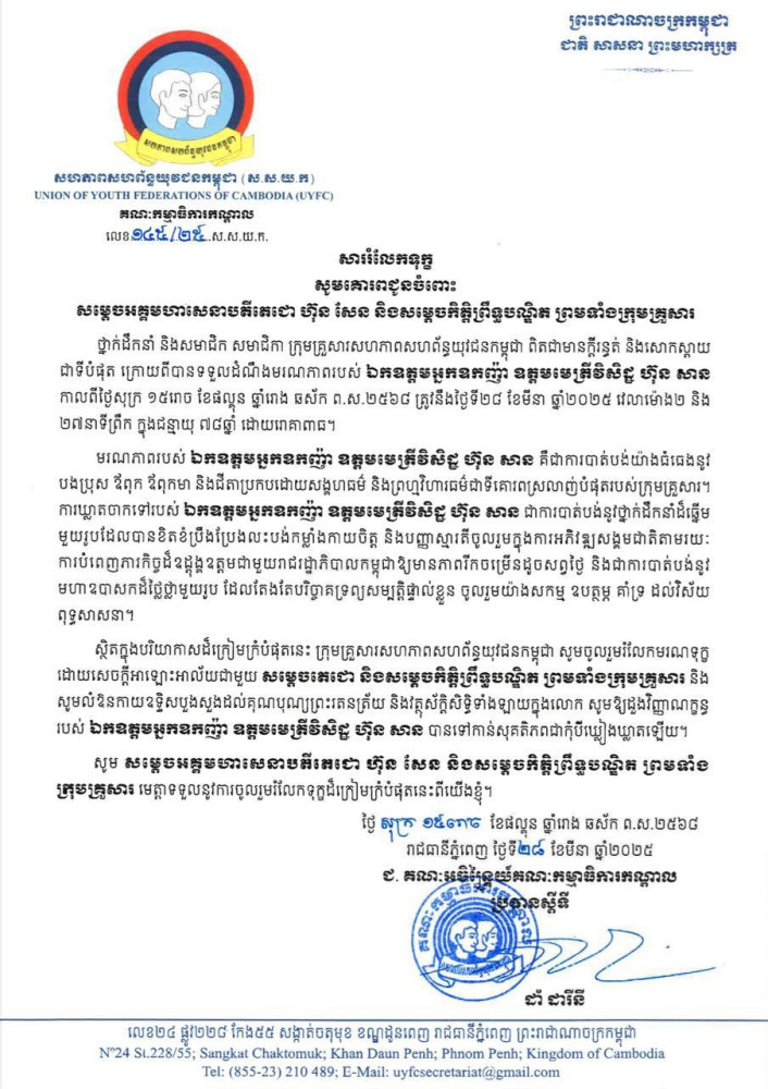 សហភាពសហព័ន្ធយុវជនកម្ពុជា ចូលរួមរំលែកមរណទុក្ខដ៏ក្រៀមក្រំបំផុត ចំពោះមរណភាពរបស់ ឯកឧត្តមអ្នកឧកញ៉ា ឧត្តមមេត្រីវិសិដ្ឋ ហ៊ុន សាន