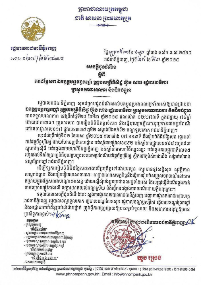 សេចក្តីជូនដំណឹង របស់រដ្ឋបាលរាជធានីភ្នំពេញ បានឱ្យដឹងថា នៅព្រឹកថ្ងៃទី០២ ខែមេសា ឆ្នាំ២០២៥ វេលាម៉ោង ០៧:១១នាទី សពឯកឧត្តមអ្នកឧកញ៉ា ឧត្តមមេត្រីវិសិដ្ឋ ហ៊ុន សាន នឹងរៀបចំពិធីដង្ហែឆ្ពោះទៅកាន់វត្តច័ន្ទបុរីវង្ស ដោយហែចេញពីគេហដ្ឋាន បត់ស្តាំតាមផ្លូវលេខ៥៩២ បត់ស្តាំតាមផ្លូវលេខ៥៩៨ រហូតដល់ស្តុបកាំកូស៊ីធី បត់ឆ្វេងតាមមហាវិថីអង្គរភ្នំពេញ បត់ស្តាំតាមមហាវិថីឈ្នះឈ្នះ បត់ឆ្វេងតាមផ្លូវជាតិលេខ៥ រហូតដល់ទីតាំងប្រារព្ធពិធីបុណ្យបញ្ចុះសពតាមប្រពៃណីនៅវត្តច័ន្ទបុរីវង្ស ស្ថិតនៅភូមិសំរោងជើង សង្កាត់សំរោង ខណ្ឌព្រែកព្នៅ រាជធានីភ្នំពេញ។