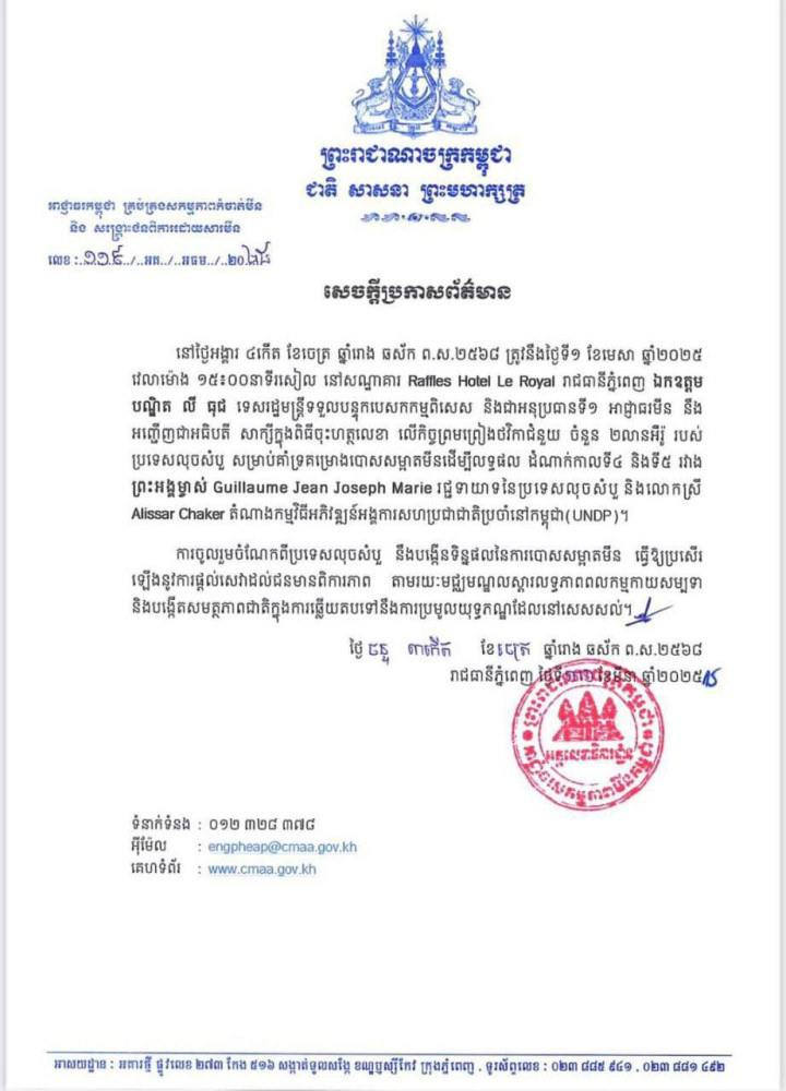 អាជ្ញាធរមីន បានប្រកាសព័ត៏មាន នៅថ្ងៃទី១ ខែមេសា ឆ្នាំ២០២៥ ឯកឧត្តម បណ្ឌិត លី ធុជ ទេសរដ្ឋមន្ត្រីទទួលបន្ទុកបេសកកម្មពិសេស និងជាអនុប្រធានទី១ អាជ្ញាធរមីន នឹង អញ្ជើញជាអធិបតី សាក្សីក្នុងពិធីចុះហត្ថលេខា លើកិច្ចព្រមព្រៀងថវិកាជំនួយ ចំនួន ២លានអឺរ៉ូ របស់ ប្រទេសលុចសំបួ សម្រាប់គាំទ្រគម្រោងបោសសម្អាតមីននៅកម្ពុជា ដើម្បីលទ្ធផល ដំណាក់កាលទី៤ និងទី៥ រវាងព្រះអង្គម្ចាស់ Guillaume Jean Joseph Marie រជ្ជទាយាទនៃប្រទេសលុចសំបួ និងលោកស្រី Alissar Chaker តំណាងកម្មវិធីអភិវឌ្ឍន៍អង្គការសហប្រជាជាតិប្រចាំនៅកម្ពុជា (UNDP)។ នៅថ្ងៃអង្គារ ៤កើត ខែចេត្រ ឆ្នាំរោង ឆស័ក ព.ស.២៥៦៨ ត្រូវនឹងថ្ងៃទី១ ខែមេសា ឆ្នាំ២០២៥ វេលាម៉ោង ១៥៖០០នាទីរសៀល នៅសណ្ឋាគារ Raffles Hotel Le Royal រាជធានីភ្នំពេញ ។