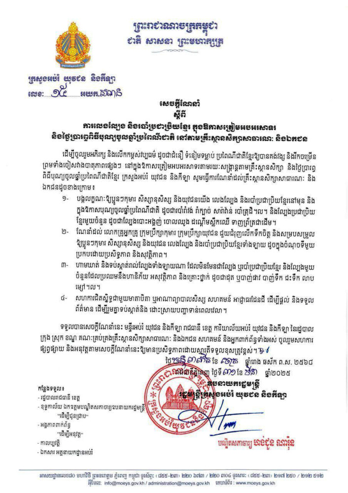 ក្រសួងអប់រំណែនាំស្តីពីការលេងល្បែង និងរបាំប្រជាប្រិយខ្មែរក្នុងឱកាសត្រៀមនិងថ្ងៃប្រារព្ធពិធីបុណ្យចូលឆ្នាំប្រពៃណីជាតិនៅតាមគ្រឹះស្ថានសិក្សាសាធារណៈ និងឯកជន