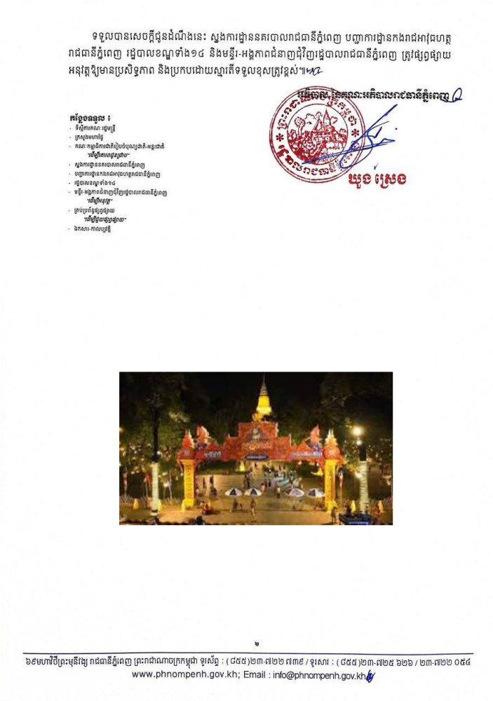 ដើម្បីឱ្យការរៀបចំកម្មវិធីខាងលើ ប្រព្រឹត្តទៅដោយរលូន រក្សាបាននូវសន្តិសុខ សុវត្ថិភាព សណ្តាប់ធ្នាប់ និងរបៀបរៀបរយសាធារណៈល្អប្រសើរ ព្រមទាំងបញ្ចៀសបាននូវការកកស្ទះចរាចរណ៍នៅជុំវិញទីតាំងរៀបចំកម្មវិធី អាជ្ញាធរមានសមត្ថកិច្ចនឹងរៀបចំចំណតយានយន្តសម្រាប់បងប្អូនប្រជាពលរដ្ឋដែលមកចូលរួមកម្សាន្តនៅ សង្ក្រាន្តវត្តភ្នំ និងផ្លូវថ្មើរជើង (Walk Street) ហើយសូមលើកទឹកចិត្តដល់បងប្អូនប្រជាពលរដ្ឋដែលពុំមានការចាំបាច់ សូមធ្វើការពង្វាងការធ្វើដំណើរឆ្លងកាត់បរិវេណទីតាំងខាងលើ និងសូមបងប្អូនប្រជាពលរដ្ឋមេត្តាយោគយល់អធ្យាស្រ័យខ្ពស់៕