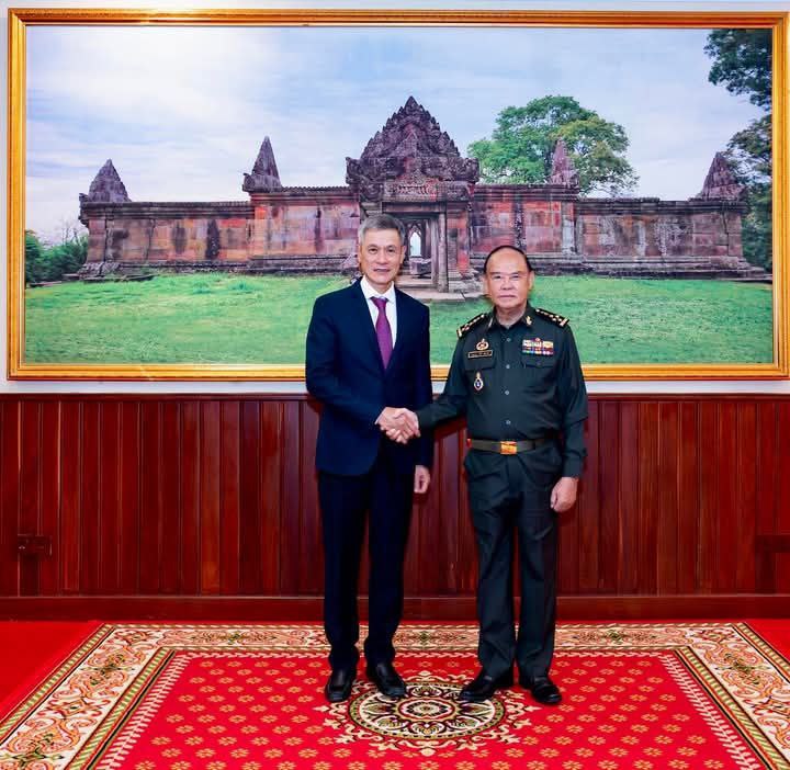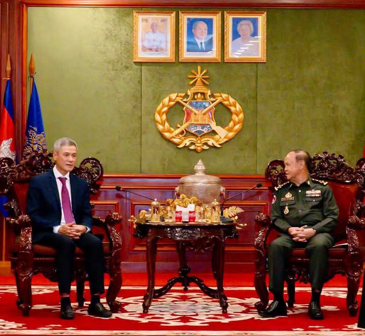 AKP ភ្នំពេញ ថ្ងៃទី០២ ខែមេសា ឆ្នាំ២០២៥-- ឯកឧត្តម នាយឧត្តមសេនីយ៍ ម៉ៅ សុផាន់ អគ្គមេបញ្ជាការរង មេបញ្ជាការកងទ័ពជើងគោក នៅរសៀលថ្ងៃទី០១ មេសា ឆ្នាំ២០២៥ បានអនុញ្ញាតឱ្យឯកឧត្តម ង្វៀន មីញវូ ឯកអគ្គរដ្ឋទូតសាធារណរដ្ឋសង្គមនិយមវៀតណាម និងលោកវរសេនីយ៍ឯក ជិន វ៉ន់តឹម នាយការិយាល័យអនុព័ន្ធយោធាវៀតណាមប្រចាំកម្ពុជា ចូលជួបជូនពរក្នុងឱកាសបុណ្យចូលឆ្នាំថ្មីប្រពៃណីជាតិខ្មែរនាពេលខាងមុខ នៅបញ្ជាការដ្ឋានកងទ័ពជើងគោក ។