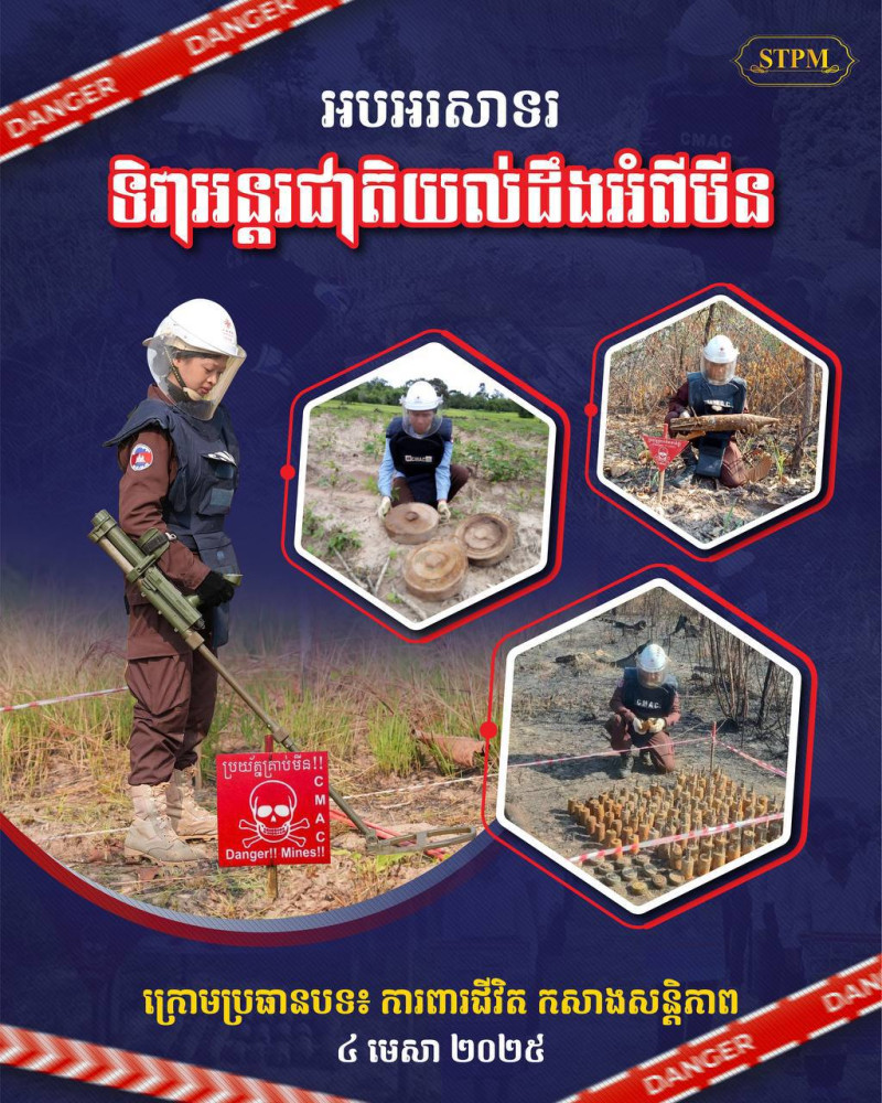 ក្នុងឱកាសនៃការប្រារព្ធទិវាអន្តរជាតិយល់ដឹងអំពីមីន ៤ មេសា ២០២៥នេះ សម្ដេចមហាបវរធិបតី ហ៊ុន ម៉ាណែត នាយករដ្ឋមន្រ្តីនៃព្រះរាជាណាចក្រកម្ពុជាបានគូសបញ្ជាក់ថា«យើងបញ្ជាក់ឡើងវិញនូវការប្តេជ្ញាចិត្តក្នុងការសម្រេចបាននូវពិភពលោកមួយដែលគ្មានមីន ជម្នះបញ្ហាប្រឈមដែលបង្កឡើងដោយគ្រាប់មីន និងប្រែក្លាយចក្ខុវិស័យរបស់យើងឱ្យក្លាយជាការពិត ដើម្បីធានាឱ្យមនុស្សជំនាន់ក្រោយអាចរស់នៅដោយសុវត្ថិភាព និងសេចក្តីថ្លៃថ្នូរ ព្រមទាំងមិនមានការគំរាមកំហែងពីគ្រាប់មីន និងសំណល់ជាតិផ្ទុះពីសង្រ្គាម»៕