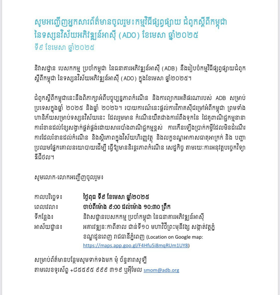 AKP ភ្នំពេញ ថ្ងៃទី០៤ ខែមេសា ឆ្នាំ២០២៥-- តាមការគ្រោងទុក នៅព្រឹកថ្ងៃទី០៩ ខែមេសា ឆ្នាំ២០២៥ខាងមុខនេះ និវាសដ្ឋានបេសកកម្មប្រចាំកម្ពុជា នៃធនាគារអភិវឌ្ឍន៍អាស៊ីនឹងធ្វើការផ្សព្វផ្សាយជំពូកស្តីពីកម្ពុជា នៃទស្សនវិស័យអភិវឌ្ឍន៍អាស៊ី (ADO) ខែមេសា ឆ្នាំ២០២៥ ជាការរំលេចអំពីបរិបទពិភពលោក និងតំបន់ ជាមួយនឹងបច្ចុប្បន្នភាពទស្សនវិស័យ សេដ្ឋកិច្ចកម្ពុជាដោយលោក Milan Thomas សេដ្ឋកិច្ចវិទូប្រចាំប្រទេស និងលោក ឌួង ពូលឡង់ មន្ត្រីជាន់ខ្ពស់ផ្នែកសេដ្ឋកិច្ច នៃនិវាសដ្ឋានបេសកកម្មប្រចាំកម្ពុជា នៃធនាគារអភិវឌ្ឍន៍អាស៊ី ដែលនឹងមានការ ថ្លែងចំណាប់អារម្មណ៍ដោយលោកស្រី Jyotsana Varma នាយិកាប្រចាំប្រទេសកម្ពុជា នៃធនាគារអភិវឌ្ឍន៍អាស៊ីផងដែរ។ នេះបើតាមការជូនដំណឹងរបស់និវាសដ្ឋានបេសកកម្មប្រចាំកម្ពុជា នៃធនាគារអភិវឌ្ឍន៍អាស៊ីចំពោះអ្នកសារព័ត៌មានដែលនឹងត្រូវអញ្ជើញឱ្យចូលរួមក្នុងកម្មវិធីផ្សព្វផ្សាយមួយនេះ។