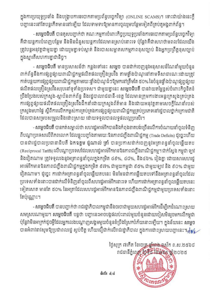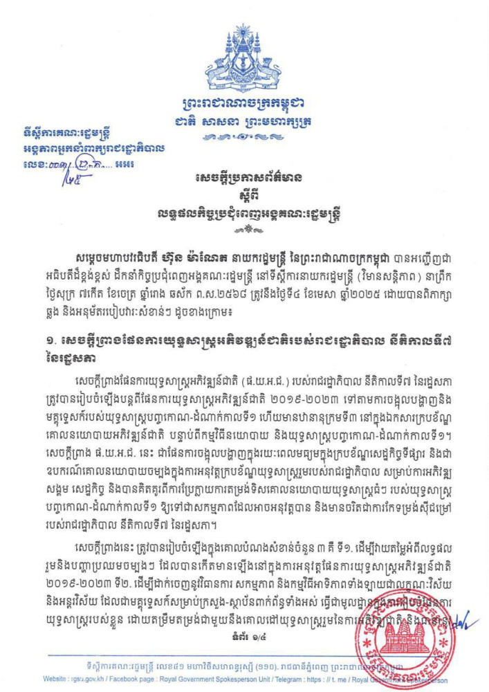 លទ្ធផល នៃកិច្ចប្រជុំពេញអង្គគណៈរដ្ឋមន្រ្តី នៅថ្ងៃទី០៤ ខែមេសា ក្រោមអធិបតីភាព សម្តេចធិបតីនាយករដ្ឋមន្ត្រី