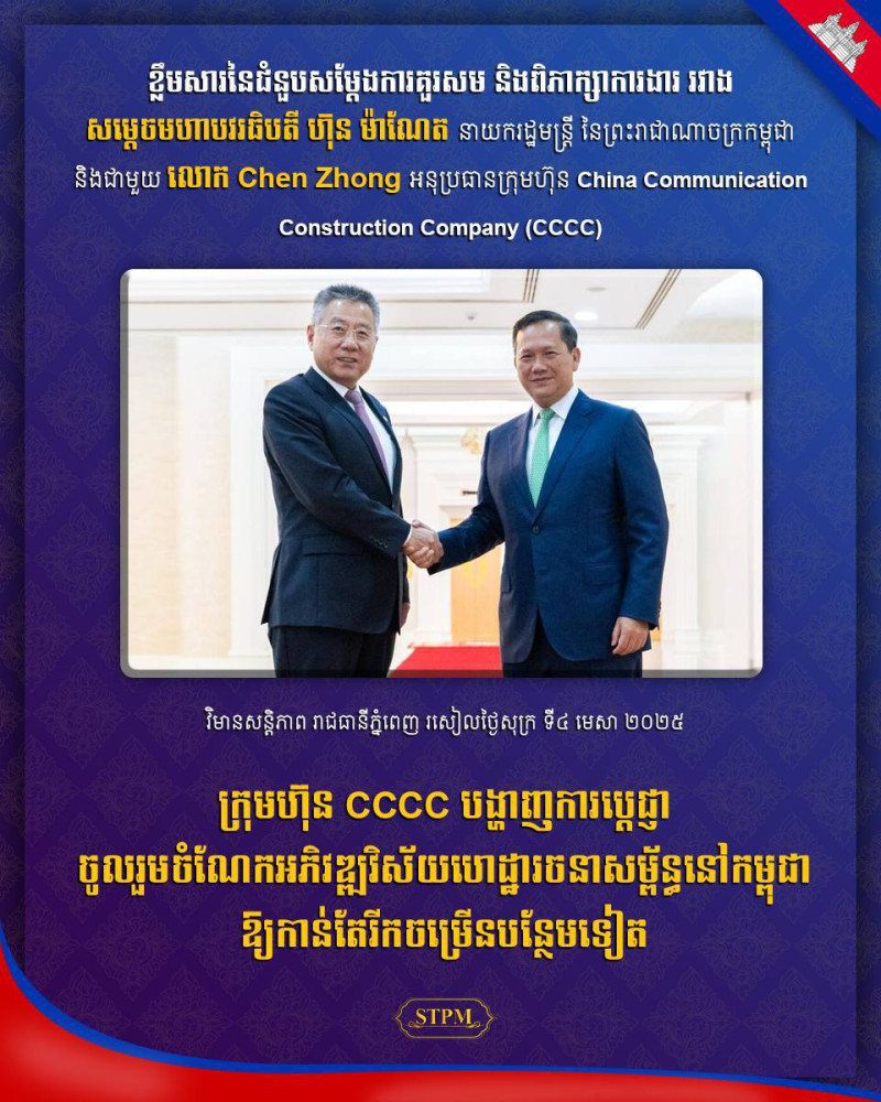 AKP ភ្នំពេញ ថ្ងៃទី០៤ ខែមេសា ឆ្នាំ២០២៥–សម្តេចមហាបវរធិបតី ហ៊ុន ម៉ាណែត នាយករដ្ឋមន្ត្រីនៃព្រះរាជាណាចក្រកម្ពុជា នៅរសៀលថ្ងៃទី០៤ ខែមេសា ឆ្នាំ២០២៥នេះ បានអនុញ្ញាតឱ្យលោក Chen Zhong អនុប្រធានក្រុមហ៊ុន China Communications Construction Company (CCCC) និងសហការី ចូលជួបសម្តែងការគួរសម និងពិភាក្សាការងារនៅវិមានសន្តិភាព។