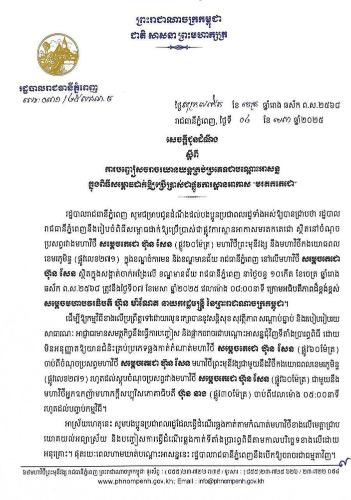 ដើម្បីឱ្យកម្មវិធីខាងលើប្រព្រឹត្តទៅដោយរលូន រក្សាបាននូវសន្តិសុខ សុវត្ថិភាព សណ្តាប់ធ្នាប់ និងរបៀបរៀបរយសាធារណៈ អាជ្ញាធរមានសមត្ថកិច្ចនឹងធ្វើការបញ្ចៀស និងផ្អាកចរាចរជាបណ្តោះអាសន្នជុំវិញទីតាំងប្រារព្ធពិធី ដោយ មិនអនុញ្ញាតឱ្យយានជំនិះគ្រប់ប្រភេទឆ្លងកាត់កំណាត់មហាវិថី សម្តេចតេជោ ហ៊ុន សែន (ផ្លូវ៦០ម៉ែត្រ) ចាប់ពីចំណុចប្រសព្វមហាវិថី សម្តេចតេជោ ហ៊ុន សែន មហាវិថីព្រះមុនីវង្សជាមួយនឹងវិថីកងយោធពលខេមរភូមិន្ទ (ផ្លូវលេខ២៧១) រហូតដល់ស្តុបចំណុចប្រសព្វរវាងមហាវិថី សម្តេចតេជោ ហ៊ុន សែន (ផ្លូវ៦០ម៉ែត្រ) ជាមួយនឹងមហាវិថីអ្នកឧកញ៉ាមហាភក្តីសប្បុរិសភោគាធិបតី ហ៊ុន នាង (ផ្លូវ៣០ម៉ែត្រ) ចាប់ពីវេលាម៉ោង ០៥៖០០នាទី រហូតដល់បញ្ចប់កម្មវិធី។