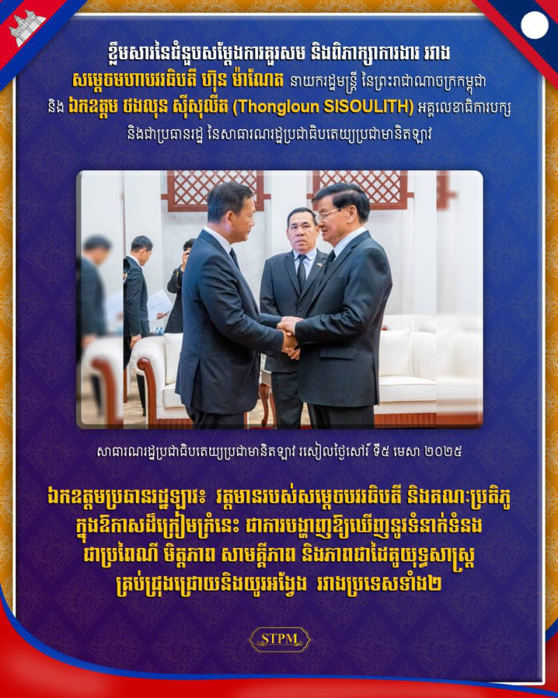AKP ភ្នំពេញ ថ្ងៃទី០៥ ខែមេសា ឆ្នាំ២០២៥–ឯកឧត្តម ថងលុន ស៊ីសូលីត អគ្គលេខាធិការបក្សប្រជាជនបដិវត្តន៍ឡាវ និងជាប្រធានរដ្ឋនៃសាធារណរដ្ឋប្រជាធិបតេយ្យ ប្រជាមានិតឡាវ នារសៀលថ្ងៃសៅរ៍ ទី០៥ខែមេសា ឆ្នាំ២០២៥នេះ បានស្វាគមន៍យ៉ាងកក់ក្តៅ និងថ្លែងអំណរគុណយ៉ាងជ្រាលជ្រៅចំពោះសម្តេចបវរធិបតី ដែលបានដឹកនាំគណៈប្រតិភូជាន់ខ្ពស់កម្ពុជា ចូលរួមដាក់កម្រងផ្កា និងគោរពវិញ្ញាណក្ខន្ធ ឯកឧត្តម នាយកឧត្តមសេនីយ៍ ខាំតៃ ស៊ីផាន់ដន អតីតប្រធានគណៈកម្មាធិការមជ្ឈិមបក្ស និងជាអតីតប្រធានរដ្ឋឡាវ។