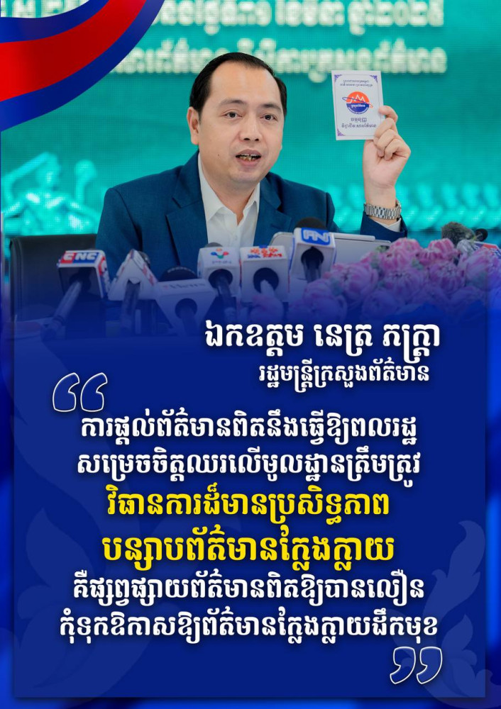 AKP ភ្នំពេញ ថ្ងៃទី០៧ ខែមេសា ឆ្នាំ២០២៥--ឯកឧត្តម នេត្រ ភក្រ្តា រដ្ឋមន្រ្តីក្រសួងព័ត៌មានបានគូសបញ្ជាក់ថា មិនបង្កើតព័ត៌មានក្លែងក្លាយ មិនផ្សព្វផ្សាយ និងមិនចែករំលែកព័ត៌មានក្លែងក្លាយ! ការផ្តល់ព័ត៌មានពិតនឹងធ្វើឱ្យប្រជាពលរដ្ឋមានមូលដ្ឋានសម្រេចចិត្តត្រឹមត្រូវ។