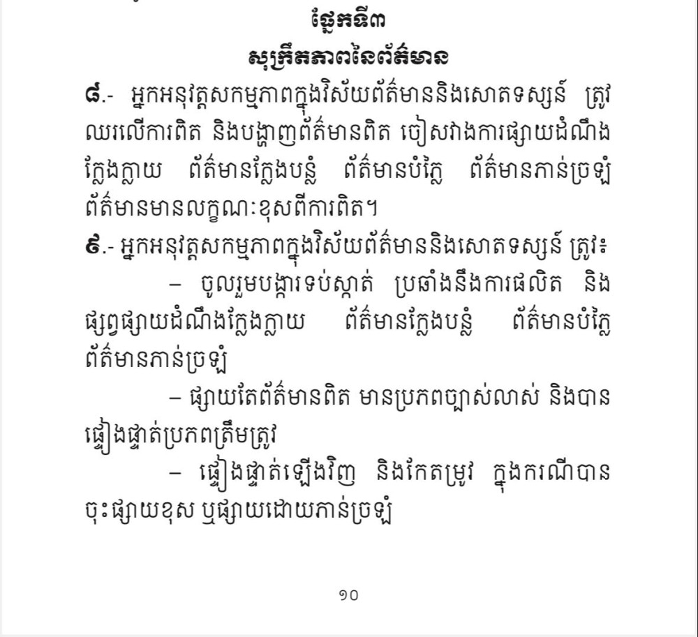 ឯកឧត្តមរដ្ឋមន្រ្តីលើកឡើងថា យោងតាមធម្មនុញ្ញវិជ្ជាជីវៈសារព័ត៌មាន ផ្នែកទី៣ ទាក់ទងនឹងសុក្រឹតភាពនៃព័ត៌មានចែងថា៖ ១-អ្នកអនុវត្តសកម្មភាពក្នុងវិស័យព័ត៌មាននិងសោតទស្សន៍ (ទាំងអ្នកសារព័ត៌មានអាជីព អ្នកផលិតមាតិកា អ្នកសរសេរប្លុក អ្នកសារព័ត៌មានគ្មានអង្គភាព អ្នកសារព័ត៌មានពលរដ្ឋ អ្នកមានប្រជាប្រិយលើបណ្តាញសង្គមជាដើម) ត្រូវឈរលើការពិត និងបង្ហាញព័ត៌មានពិត ចៀសវាងការផ្សាតយដំណឹងក្លែងក្លាយ ព័ត៌មានក្លែងបន្លំ ព័ត៌មានបំភ្លៃ ព័ត៌មានភាន់ច្រឡំ ព័ត៌មានមានលក្ខណៈខុសពីការពិត។ ២-អ្នកអនុវត្តសកម្មភាពក្នុងវិស័យព័ត៌មានត្រូវ (ក) ចូលរួមទប់ស្កាត់ ប្រឆាំងនឹងការផលិត និងផ្សព្វផ្សាយដំណឹងក្លែងក្លាយ ព័ត៌មានក្លែងបន្លំ ព័ត៌មានបំភ្លៃ ព័ត៌មានភាន់ច្រឡំ (ខ) ផ្សាយតែព័ត៌មានពិត មានប្រភពច្បាស់លាស់ និងបានផ្ទៀងផ្ទាត់ប្រភពត្រឹមត្រូវ (គ) ផ្ទៀងផ្ទាត់ឡើងវិញ និងកែតម្រូវក្នុងករណីបានចុះផ្សាយខុស ឬផ្សាយដោយភាន់ច្រឡំ (គ) រក្សាការសម្ងាត់នៃប្រភព (ឃ) ធានាតុល្យភាពព័ត៌មានប្រកបដោយសច្ចភាព យុត្តិធម៌ និងមិនលម្អៀង។ ៣-អ្នកអនុវត្តសកម្មភាពក្នុងវិស័យព័ត៌មាននិងសោតទស្សន៍ត្រូវចៀសវាង (ក) ការចុះផ្សាយព័ត៌មានដែលគ្មានប្រភពច្បាស់លាស់ ឬធ្វើការចោទប្រកាន់ដែលមិនមានភស្តុតាងគ្រប់គ្រាន់ និងច្បាស់លាស់ (ខ)កាឡៃព័ត៌មានតាមរូបភាពណាមួយដែលធ្វើឱ្យប្រាសចាកន័យដើម (គ) បញ្ចេញមតិផ្ទាល់ខ្លួនឈរលើបុរេវិនិច្ឆ័យ (ឃ) ច្របល់គ្នារវាង ការពិតដែលជាអង្គហេតុ និងការយល់ឃើញដែលជាទស្សនៈផ្ទាល់ខ្លួន (ង) កែប្រែព័ត៌មាន រូបភាព ឬវីដេអូ លុបបំបាត់ចោលផ្នែកព័ត៌មានសំខាន់ៗ ឬបន្លំឯកសារផ្សេងៗ៕