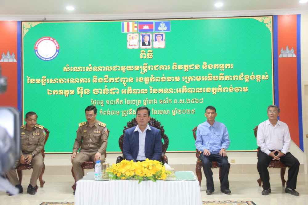 AKP កំពង់ចាម ថ្ងៃទី៨ ខែមេសា ឆ្នាំ២០១៥--មន្ទីរសាធារណការដឹកជញ្ជូនខេត្តកំពង់ចាមនារសៀលថ្ងៃទី៧ មេសាឆ្នាំ២០២៥មានរៀបចំពិធី អញ្ជើញជួបសំណេះសំណាលជាមួយបុគ្គលិកមន្ត្រីរាជការ មន្ត្រីកិច្ចសន្យានិងនិវត្តជន ក្នុងឱកាសបុណ្យចូលឆ្នាំថ្មីប្រពៃណីជាតិខ្មែរយើងក្រោមអធិបតីភាពរបស់ឯកឧត្តម អ៊ុន ចាន់ដា អភិបាលនៃគណៈអភិបាលខេត្តកំពង់ចាម។