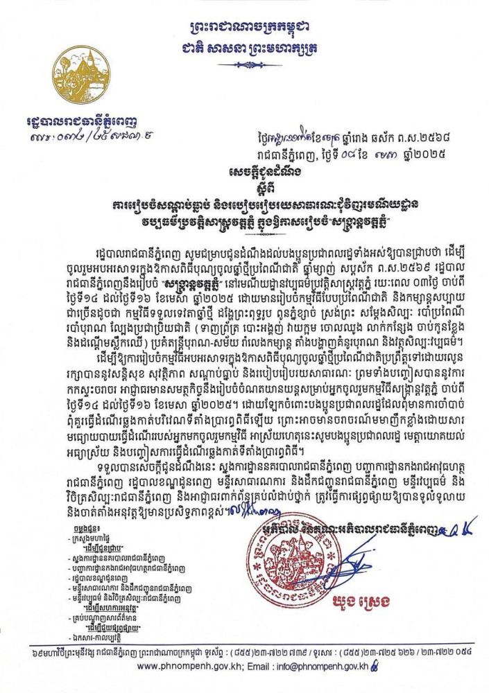 AKP ភ្នំពេញ ថ្ងៃទី០៨ ខែមេសា ឆ្នាំ២០២៥-- ពាក់ព័ន្ធនឹងការរៀបចំសណ្តាប់ធ្នាប់ និងរបៀបរៀបរយសាធារណៈជុំវិញរមណីយដ្ឋាន វប្បធម៌ប្រវត្តិសាស្ត្រវត្តភ្នំ ក្នុងឱកាសរៀបចំសង្ក្រាន្តវត្តភ្នំ រដ្ឋបាលរាជធានីភ្នំពេញសូមជូនដំណឹងដល់បងប្អូនប្រជាពលរដ្ឋទាំងអស់ឱ្យបានជ្រាបថា ដើម្បីចូលរួមអបអរសាទរក្នុងឱកាសពិធីបុណ្យចូលឆ្នាំថ្មីប្រពៃណីជាតិ ឆ្នាំម្សាញ់ សប្តស័ក រដ្ឋបាលរាជធានីភ្នំពេញនឹងរៀបចំសង្ក្រាន្តវត្តភ្នំនៅរមណីយដ្ឋានវប្បធម៌ប្រវត្តិសាស្ត្រវត្តភ្នំ រយៈពេល០៣ថ្ងៃ ចាប់ពីថ្ងៃទី១៤ ដល់ថ្ងៃទី១៦ ខែមេសា ឆ្នាំ២០២៥ ដោយមានរៀបចំកម្មវិធីបែបប្រពៃណីជាតិ និងកម្សាន្តសប្បាយជាច្រើន ដូចជា កម្មវិធីទទួលទេវតាឆ្នាំថ្មី ដង្ហែព្រះពុទ្ធរូប ពូនភ្នំខ្សាច់ ស្រង់ព្រះ សម្តែងសិល្បៈ របាំប្រពៃណី របាំបុរាណ ល្បែងប្រជាប្រិយជាតិ (ទាញព្រ័ត្រ បោះអង្គញ់ វាយក្អម ចោលឈូង លាក់កន្សែង ចាប់កូនខ្លែង និងដណ្តើមស្លឹកឈើ) ប្រគំតន្ត្រីបុរាណ-សម័យ រាំលេងកម្សាន្ត តាំងបង្ហាញគំនូរបុរាណ និងវត្ថុសិល្បៈវប្បធម៌។