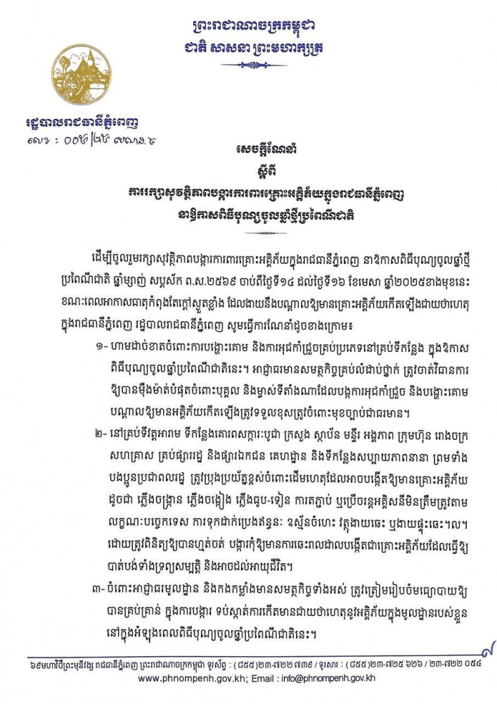 រដ្ឋបាលរាជធានីភ្នំពេញចេញសេចក្តីណែនាំស្តីពីការរក្សាសុវត្ថិភាព បង្ការការពារគ្រោះអគ្គិភ័យក្នុងរាជធានីភ្នំពេញ នាឱកាសពិធីបុណ្យចូលឆ្នាំថ្មីប្រពៃណីជាតិ