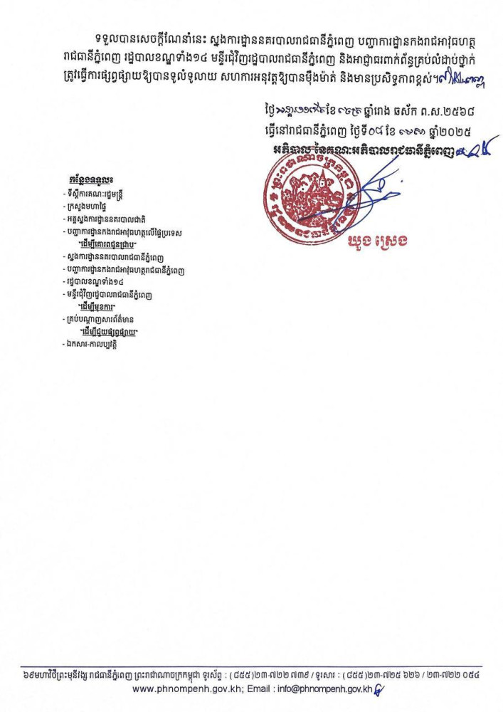 បន្ទាប់ពីទទួលបានសេចក្តីណែនាំនេះ ស្នងការដ្ឋាននគរបាលរាជធានីភ្នំពេញ បញ្ជាការដ្ឋានកងរាជអាវុធហត្ថ រាជធានីភ្នំពេញ រដ្ឋបាលខណ្ឌទាំង១៤ មន្ទីរជុំវិញរដ្ឋបាលរាជធានីភ្នំពេញ និងអាជ្ញាធរពាក់ព័ន្ធគ្រប់លំដាប់ថ្នាក់ ត្រូវធ្វើការផ្សព្វផ្សាយឱ្យបានទូលំទូលាយ សហការអនុវត្តឱ្យបានម៉ឺងម៉ាត់ និងមានប្រសិទ្ធភាពខ្ពស់៕