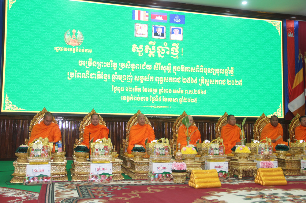 AKP កំពង់ចាម ថ្ងៃទី១០ ខែមេសា ឆ្នាំ២០២៥ -- រដ្ឋបាលខេត្តកំពង់ចាមបានរៀចំពិធីសូត្រមន្តចម្រើនព្រះបរិត្ត និងជួបសំណេះសំណាលជាមួយមន្ត្រីរាជ ក្នុងឱកាសអបអរឆ្នាំថ្មីប្រពៃណីជាតិ ឆ្នាំម្សាញ់ សប្តស័ក ព.ស.២៥៦៩ ដែលនឹងឈានចូលមកដល់នាពេលខាងមុខ ក្រោមអធិបតីភាព ឯកឧត្តម ខ្លូត ផន ប្រធានក្រុមប្រឹក្សាខេត្ត និងឯកឧត្តម អ៊ុន ចាន់ដា អភិបាលខេត្តកំពង់ចាម ដោយមានការអញ្ជើញចូលរួមពីឯកឧត្តម លោកជំទាវ សមាជិកក្រុមប្រឹក្សាខេត្ត អភិបាលរងខេត្ត លោក លោកស្រីនាយក នាយករងទីចាត់ការ និងអង្គភាពចំណុះសាលាខេត្ត មន្ត្រីរាជការ មន្ត្រីជាប់កិច្ចសន្យានៃរដ្ឋបាលខេត្តកំពង់ចាម។