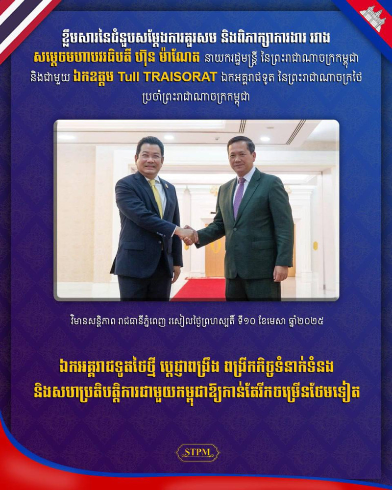 AKP ភ្នំពេញ ថ្ងៃទី១០ ខែមេសា ឆ្នាំ២០២៥–សម្ដេចមហាបវរធិបតី ហ៊ុន ម៉ាណែត នាយករដ្ឋមន្ត្រីនៃព្រះរាជាណាចក្រកម្ពុជា នារសៀលថ្ងៃទី១០ ខែមេសា ឆ្នាំ២០២៥នេះ បានទទួលជួបសម្តែងការគួរសម និងពិភាក្សាការងារជាមួយ ឯកឧត្តម Tull TRAISORAT ឯកអគ្គរាជទូតព្រះរាជាណាចក្រថៃថ្មីប្រចាំព្រះរាជាណាចក្រកម្ពុជា នៅវិមានសន្តិភាព។