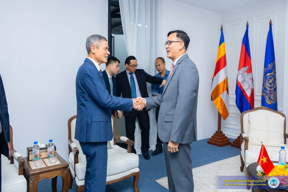 AKP ភ្នំពេញ ថ្ងៃទី១១ ខែមេសា ឆ្នាំ២០២៥-- ឯកឧត្ដម ឡាំ ជា រដ្ឋមន្រ្ដីទទួលបន្ទុករដ្ឋលេខាធិការដ្ឋានកិច្ចការព្រំដែន បានអនុញ្ញាតឱ្យឯកឧត្តម ង្វៀន ម៉ិញវូ (Nguyen Minh Vu) ឯកអគ្គរដ្ឋទូតវិសាមញ្ញ និងពេញសមត្ថភាពនៃសាធារណរដ្ឋសង្គមនិយមវៀតណាមប្រចាំព្រះរាជាណាចក្រកម្ពុជា ដឹកនាំគណៈប្រតិភូ ចូលជួបសម្ដែងការគួរសម និងពិភាក្សាការងារ នៅបន្ទប់បដិសណ្ឋារកិច្ចនៃទីស្ដីការរដ្ឋលេខាធិការដ្ឋានកិច្ចការព្រំដែន។