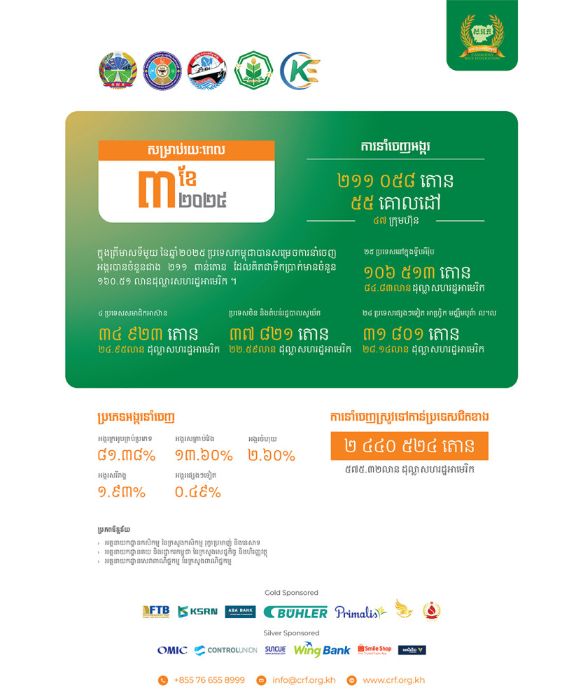 ក្នុងរយៈពេល ត្រីមាសទី១ នៃឆ្នាំ២០២៥ កម្ពុជាបាននាំចេញអង្ករបានចំនួន ២១១ ០៥៨ តោន តាមរយៈក្រុមហ៊ុននាំចេញអង្ករចំនួន ៤៧ ក្រុមហ៊ុន ទៅកាន់គោលដៅចំនួន ៥៥ ដែលក្នុងនោះទៅកាន់បណ្តាប្រទេសនៅក្នុងតំបន់អឺរ៉ុបចំនួន ២៥ បានបរិមាណអង្ករចំនួន ១០៦ ៥១៣ តោន គិតជាទឹកប្រាក់ចំនួន ៨៤.៨៣ លានដុល្លារសហរដ្ឋអាមេរិក ទៅកាន់ប្រទេសចិន និងហុងកុង ចំនួន ៣៧ ៨២១ តោន គិតជាទឹកប្រាក់ចំនួន ២២.៥៩ លានដុល្លារសហរដ្ឋអាមេរិក ទៅកាន់ប្រទេសក្នុងអាស៊ាន ចំនួន ៤ ប្រទេសបានបរិមាណចំនួន ៣៤ ៩២៣ តោន គិតជាទឹកប្រាក់ចំនួន ២៤.៩៥ លានដុល្លារសហរដ្ឋអាមេរិក និងទៅកាន់គោលដៅ ២៤ ប្រទេសផ្សេងទៀតមានអាហ្វ្រិក មជ្ឈឹម បូព៌ា អាមេរិក កាណាដា អូស្ត្រាលី ញ៉ូហ្សេឡេន ។ល។ បានចំនួន ៣១ ៨០១ តោន គិតជាទឹកប្រាក់ចំនួន ២៨.១៤ លានដុល្លារសហរដ្ឋអាមេរិក។