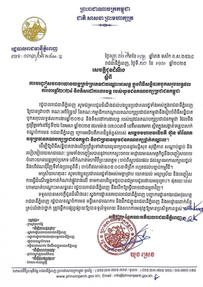 សេចក្ដីជូនដំណឹងចេញថ្ងៃទី១១ ខែមេសា ឆ្នាំ២០២៥នេះ បានបញ្ជាក់ថា ដើម្បីឱ្យពិធីសន្និបាតខាងលើប្រព្រឹត្តទៅដោយរលូនរក្សាបាននូវសន្តិសុខ សុវត្ថិភាព សណ្តាប់ធ្នាប់ និងរបៀបរៀបរយសាធារណៈ ព្រមទាំងបញ្ចៀសបាននូវការកកស្ទះចរាចរ អាជ្ញាធរមានសមត្ថកិច្ចនឹងបញ្ចៀសចរាចរ ចំពោះយានយន្តគ្រប់ប្រភេទ លើកំណាត់មហាវិថីព្រះនរោត្តម (ចាប់ពីស្តុបជលផល ដល់ស្ពានអាកាសក្បាលថ្នល់ និងបរិវេណជុំវិញទីតាំងប្រារព្ធពិធី) ចាប់ពីវេលាម៉ោង០៥៖០០ នាទីព្រឹក រហូតដល់បញ្ចប់កម្មវិធី។