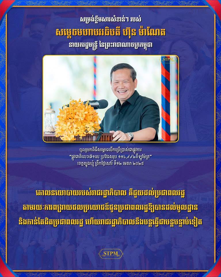AKP ត្បូងឃ្មុំ ថ្ងៃទី១២ ខែមេសា ឆ្នាំ២០២៥–សម្ដេចមហាបវរធិបតី ហ៊ុន ម៉ាណែត នាយករដ្ឋមន្ត្រី នៃព្រះរាជាណាចក្រកម្ពុជា បានថ្លែងក្នុងពិធីសម្ពោធដាក់ឱ្យប្រើប្រាស់ជាផ្លូវការ ផ្លូវជាតិលេខ៧១សេ ក្រោមឥណទានសម្បទានពីរដ្ឋាភិបាលចិន នាព្រឹកថ្ងៃសៅរ៍ទី១២ ខែមេសា ឆ្នាំ២០២៥ ថា៖ គោលនយោបាយរបស់រាជរដ្ឋាភិបាល គឺជួយប្រជាពលរដ្ឋ តាមរយៈការបែងចែក និងពង្រាយផលប្រយោជន៍ ជូនប្រជាពលរដ្ឋឱ្យបានដល់មូលដ្ឋាន និងកាន់តែជិតប្រជាពលរដ្ឋ ហើយរាជរដ្ឋាភិបាលនឹងបន្តធ្វើជាបន្តបន្ទាប់ទៀត។ អភិក្រមនៃការធ្វើផ្លូវ គឺត្រូវធ្វើដេីម្បីតភ្ជាប់តំបន់ប៉ូលសេដ្ឋកិច្ចក្នុងប្រទេសរបស់យើង និងពង្រីកផ្លូវឱ្យបានច្រើនខ្សែបន្ថែមទៀត ដែលជាសរសៃឈាមសេដ្ឋកិច្ច និងដើម្បីសម្រួលដល់ការធ្វើដំណើរ និងដឹកជញ្ជូន របស់ប្រជាពលរដ្ឋយើង។ "មានផ្លូវ មានសង្ឃឹម" ពេលណាមានផ្លូវ អ្វីៗនឹងកើតឡើងជាបន្តបន្ទាប់នៅតាមដងផ្លូវ រួមមានទាំងភោជនីយដ្ឋាន ស្ថានីយ៍ប្រេងឥន្ធនៈ ភូមិឋានប្រជាពលរដ្ឋរស់នៅ មន្ទីរពេទ្យនិងសាលារៀន ជាដើម។ ការភ្ជាប់ស្ពាន និងផ្លូវ នេះពុំមែនសម្រាប់តែអ្នកស្ទឹងត្រង់ និងអ្នកក្រូចឆ្មារទេ ប៉ុន្តែសម្រាប់បម្រើជូនប្រជាពលរដ្ឋអ្នកខេត្តកំពង់ចាម និងខេត្តត្បូងឃ្មុំ រួមទាំងប្រជាពលរដ្ឋនៅទូទាំងប្រទេស ឱ្យធ្វើដំណើរកាន់តែងាយស្រួល ឆាប់រហ័ស ជាពិសេស ជួយលើកកម្ពស់ជីវភាព និងសេដ្ឋកិច្ចក្នុងមូលដ្ឋាន ហើយធ្វើឱ្យប្រជាពលរដ្ឋកាន់តែមានភាពងាយស្រួលក្នុងការភ្ជាប់ទំនាក់ទំនង និងឯករាជ្យភាពក្នុងការធ្វេីដំណេីរ។ សមិទ្ធផលថ្ងៃនេះ បានបង្ហាញពីការកសាងសមិទ្ធផល រាជរដ្ឋាភិបាលកម្ពុជាគ្រប់ជំនាន់ ដែលដឹកនាំដោយរបស់គណបក្សប្រជាជនកម្ពុជា សម្រាប់ឆ្លើយតប និង បំពេញតម្រូវការជាក់ស្តែង ជូនប្រជាពលរដ្ឋ។