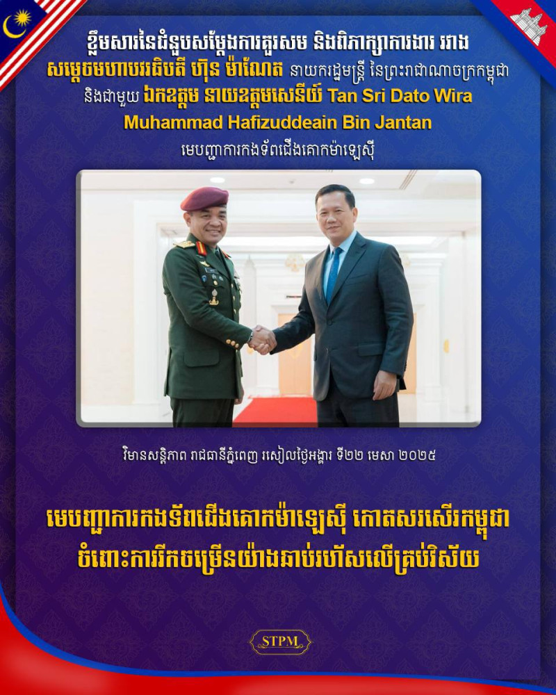 AKP ភ្នំពេញ ថ្ងៃទី២២ ខែមេសា ឆ្នាំ២០២៥–សម្តេចមហាបវរធិបតី ហ៊ុន ម៉ាណែត នាយករដ្ឋមន្ត្រីនៃព្រះរាជាណាចក្រកម្ពុជា នារសៀលថ្ងៃទី២២ ខែមេសា ឆ្នាំ២០២៥ បានអនុញ្ញាតឱ្យឯកឧត្តមនាយឧត្តមសេនីយ៍ Tan Sri Dato Wira Muhammad Hafizuddeain Bin Jantan មេបញ្ជាការកងទ័ពជើងគោកម៉ាឡេស៊ី ចូលជួបសម្តែងការគួរសម និងពិភាក្សាការងារនៅវិមានសន្តិភាព។