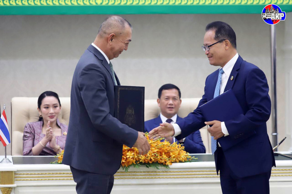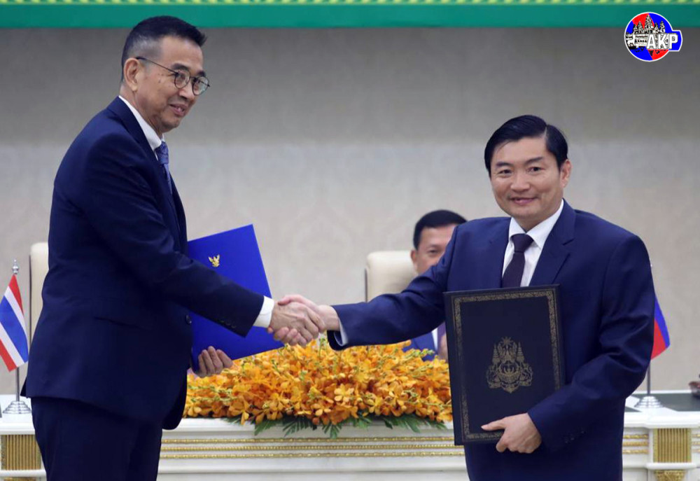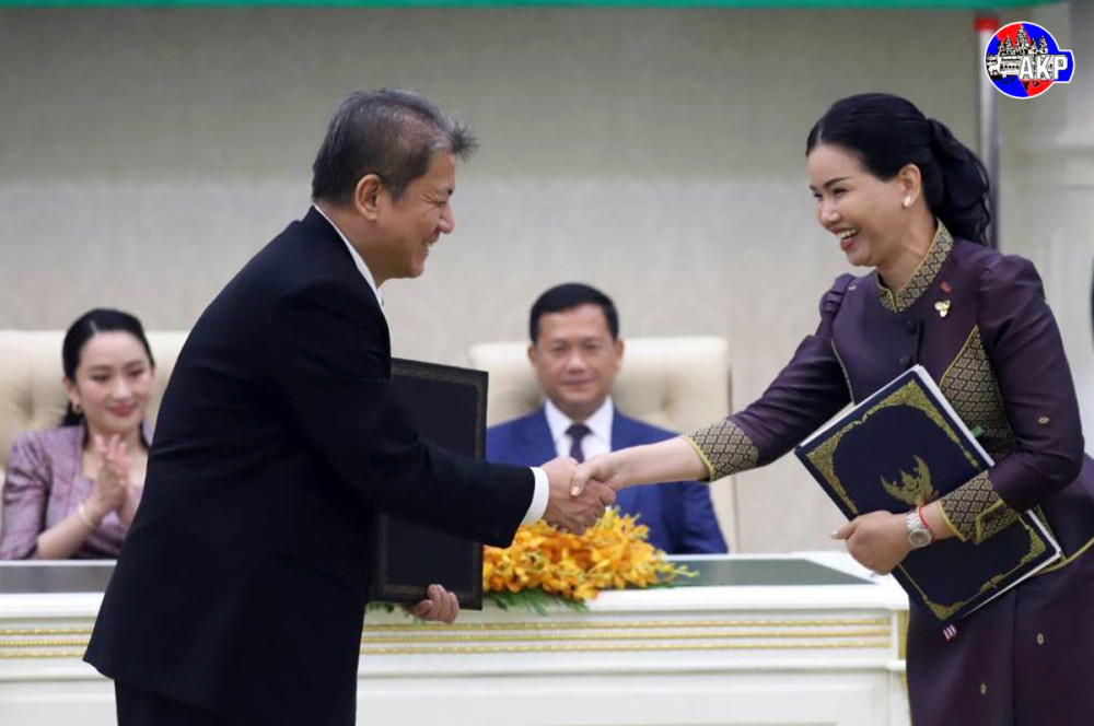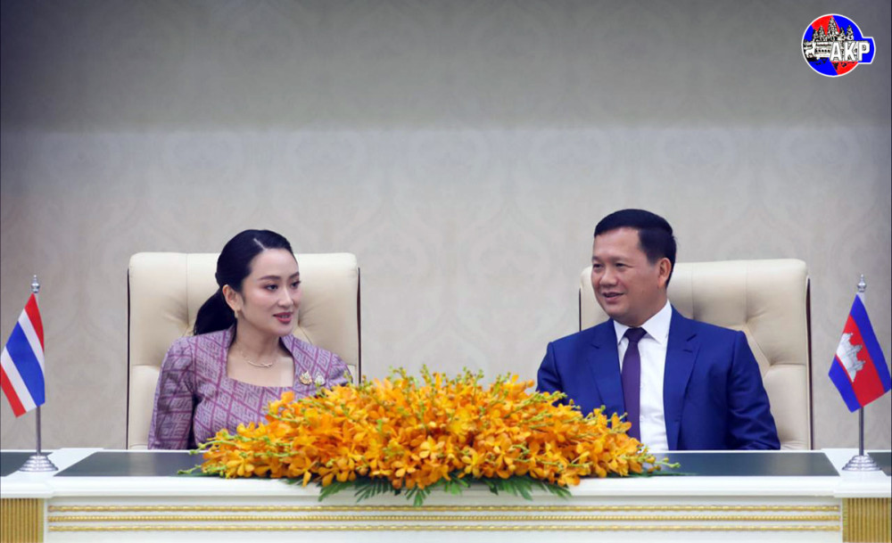 AKP ភ្នំពេញ ថ្ងៃទី២៣ ខែមេសា ឆ្នាំ២០២៥--សម្តេចមហាបវរធិបតី ហ៊ុន ម៉ាណែត នាយករដ្ឋមន្ត្រី នៃព្រះរាជាណាចក្រកម្ពុជា និង លោកជំទាវ ផែថងថាន ស៊ីណាវ៉ាត់ (Paetongtarn Shinawatra) នាយករដ្ឋមន្ត្រី នៃព្រះរាជាណាចក្រថៃ នាព្រឹកថ្ងៃពុធ ទី២៣ ខែមេសា ឆ្នាំ២០២៥នេះ បានអញ្ជើញចូលរួមជាសហអធិបតីភាព ក្នុងពិធីចុះហត្ថលេខាលើឯកសារចំនួន០៧ នៅវិមានសន្តិភាពនៃទីស្ដីការគណៈរដ្ឋមន្ត្រី។