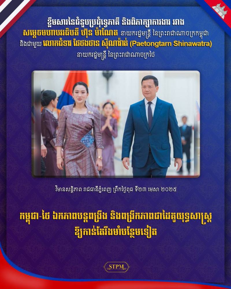 សម្តេចមហាបវរធិបតី ហ៊ុន ម៉ាណែត នាយករដ្ឋមន្រ្តី នៃព្រះរាជាណាចក្រកម្ពុជា នាព្រឹកថ្ងៃទី២៣ ខែមេសា ឆ្នាំ២០២៥នេះ បានជួបពិភាក្សាការងារទ្វេភាគី ជាមួយ លោកជំទាវ ផែថងថាន ស៊ីណាវ៉ាត់ (Paetongtarn Shinawatra) នាយករដ្ឋមន្ត្រី នៃព្រះរាជាណាចក្រថៃ និងគណៈប្រតិភូជាន់ខ្ពស់ ក្នុងដំណេីរទស្សនកិច្ចផ្លូវការ នៅព្រះរាជាណាចក្រកម្ពុជា នៅវិមានសន្តិភាព។