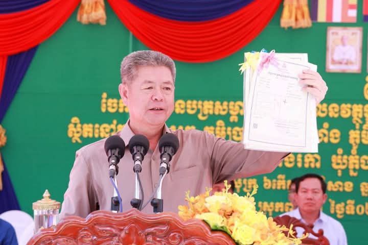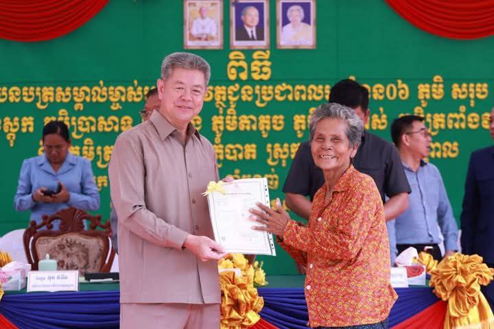 ការចែកបណ្ណកម្មសិទ្ធជូនបងប្អូនប្រជាពលរដ្ឋនៅពេលនេះ ជាការឆ្លុះបញ្ចាំងឱ្យឃើញអំពីការយកចិត្តទុកដាក់ខ្ពស់របស់រាជរដ្ឋាភិបាល ក្រោមការដឹកនាំរបស់សម្តេចមហាបវរធិបតី ហ៊ុន ម៉ាណែត នាយករដ្ឋមន្ត្រីនៃព្រះរាជាណាចក្រកម្ពុជា ក្នុងការធានាកម្មសិទ្ធិដីធ្លីស្របច្បាប់ ជូនប្រជាពលរដ្ឋ សំដៅលើកកម្ពស់ជីវភាព សុខុមាលភាព និងការកាត់បន្ថយភាពក្រីក្រ ព្រមទាំងរួមចំណែក ដល់ ការពង្រឹង យុត្តិធម៌ និងស្ថេរភាពសង្គម។