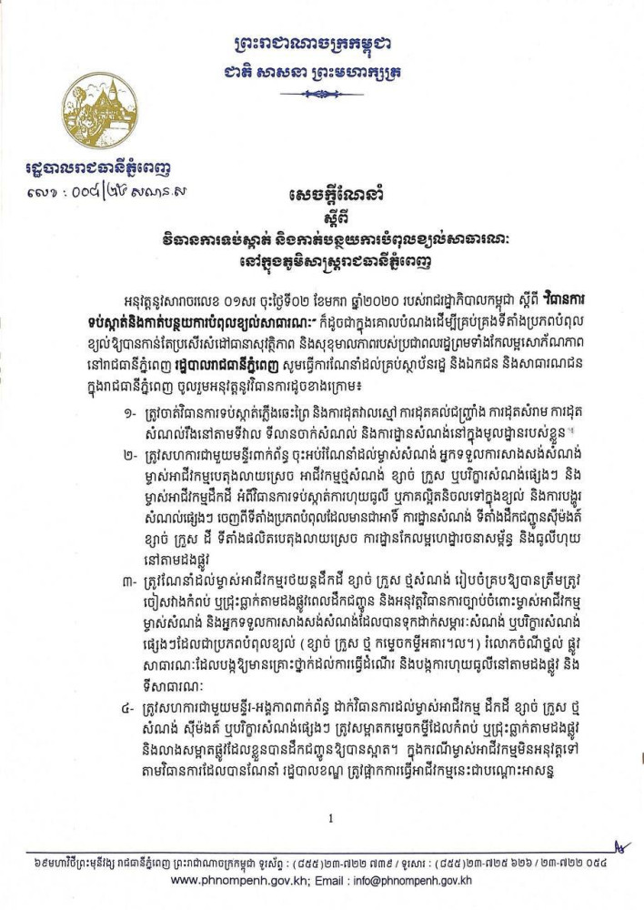 រដ្ឋបាលរាជធានីភ្នំពេញចេញសេចក្តីណែនាំឱ្យអាជ្ញាធរខណ្ឌ សង្កាត់ មន្ទីរ ចុះអប់រំណែនាំដល់ម្ចាស់អាជីវកម្ម នៅមូលដ្ឋានខ្លួនត្រូវធានាសុវត្ថិភាព និងសុខុមាលភាពរបស់ប្រជាពលរដ្ឋ