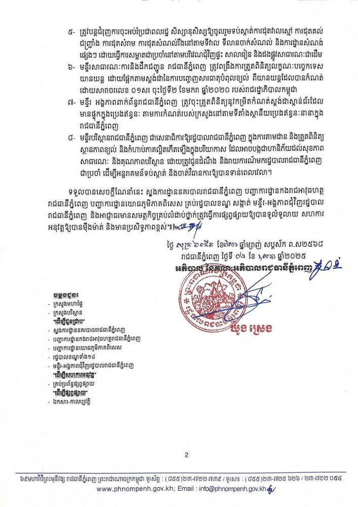 ទន្ទឹមនឹងនេះ ស្នងការដ្ឋាននគរបាលរាជធានីភ្នំពេញ បញ្ជាការដ្ឋានកងរាជអាវុធហត្ថ រាជធានីភ្នំពេញ បញ្ជាការដ្ឋានយោធភូមិភាគពិសេស គ្រប់រដ្ឋបាលខណ្ឌ សង្កាត់ មន្ទីរ-អង្គភាពជុំវិញរដ្ឋបាលរាជធានីភ្នំពេញ និងអាជ្ញាធរមានសមត្ថកិច្ចគ្រប់លំដាប់ថ្នាក់ត្រូវធ្វើការផ្សព្វផ្សាយឱ្យបានទូលំទូលាយ សហការអនុវត្តឱ្យបានម៉ឺងម៉ាត់ និងមានប្រសិទ្ធភាពខ្ពស់៕