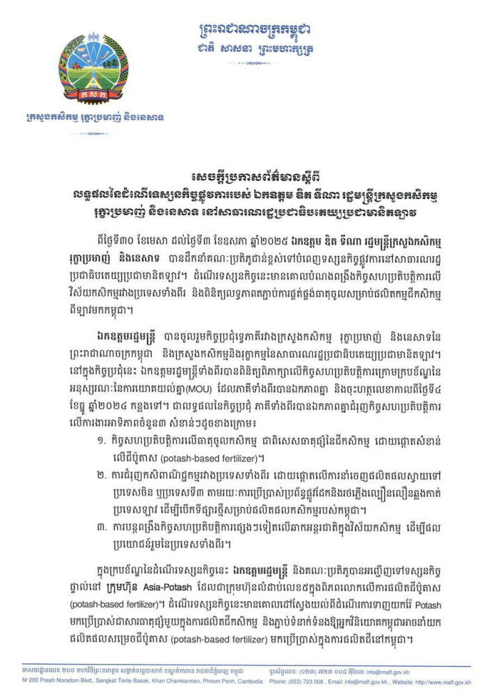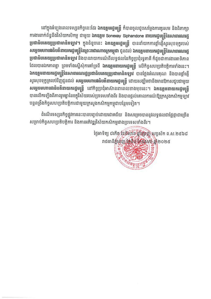 យោងតាមសេចក្តីប្រកាសនេះក្រសួងកសិកម្មបានបញ្ជាក់ថា ឯកឧត្តមរដ្ឋមន្ត្រីបានចូលរួមកិច្ចប្រជុំទ្វេភាគីរវាងក្រសួងកសិកម្ម រុក្ខាប្រមាញ់ និងនេសាទនៃព្រះរាជាណាចក្រកម្ពុជា និងក្រសួងកសិកម្មនិងរុក្ខាកម្មនៃសាធារណរដ្ឋប្រជាធិបតេយ្យប្រជាមានិតឡាវ។