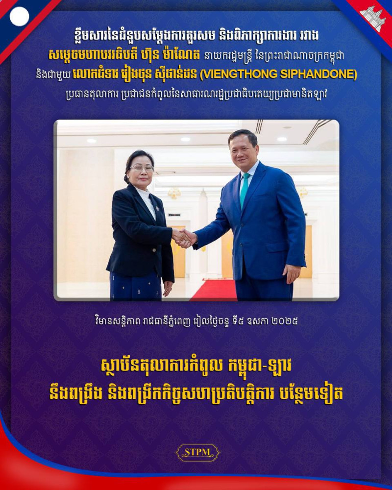 AKP ភ្នំពេញ ថ្ងៃទី០៥ ខែឧសភា ឆ្នាំ២០២៥–សម្តេចមហាបវរធិបតី ហ៊ុន ម៉ាណែត នាយករដ្ឋមន្ត្រីនៃព្រះរាជាណាចក្រកម្ពុជា នារសៀលថ្ងៃទី៥ ខែឧសភា ឆ្នាំ២០២៥នេះ បានអនុញ្ញាតឱ្យលោកជំទាវ វៀងថុន ស៊ីផាន់ដន (Viengthong Siphandone) ប្រធានតុលាការប្រជាជនកំពូលនៃសាធារណរដ្ឋប្រជាធិបតេយ្យប្រជាមានិតឡាវ ចូលជួបសម្តែងការគួរសម និងពិភាក្សាការងារ នៅវិមានសន្តិភាព។