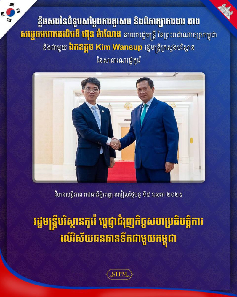 AKP ភ្នំពេញ ថ្ងៃទី០៥ ខែឧសភា ឆ្នាំ២០២៥–សម្តេចមហាបវរធិបតី ហ៊ុន ម៉ាណែត នាយករដ្ឋមន្ត្រីនៃព្រះរាជាណាចក្រកម្ពុជា នារសៀលថ្ងៃទី០៥ ខែឧសភា ឆ្នាំ២០២៥នេះ បានអនុញ្ញាតឱ្យឯកឧត្តម Kim Wansup រដ្ឋមន្ត្រីក្រសួងបរិស្ថាន នៃសាធារណរដ្ឋកូរ៉េ ចូលជួបសម្តែងការគួរសម និងពិភាក្សាការងារ នៅវិមានសន្តិភាព។