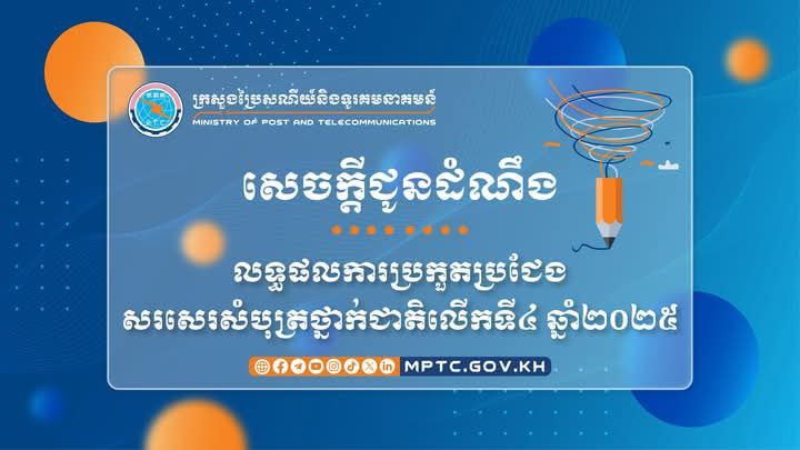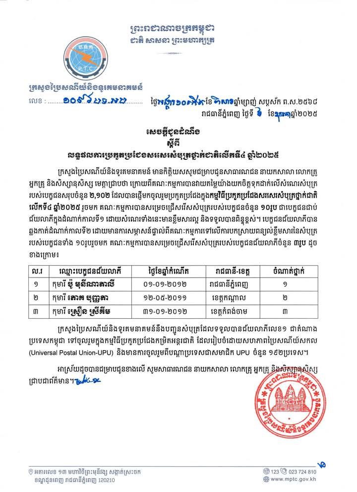 ក្រសួងប្រៃសណីយ៍បង្ហាញលទ្ធផលការប្រកួតប្រជែងសរសេរសំបុត្រថ្នាក់ជាតិលើកទី៤ ឆ្នាំ២០២៥